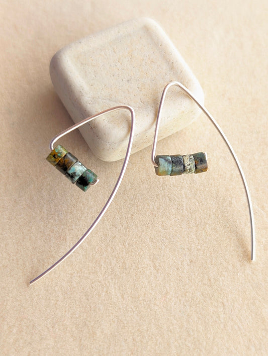 Silver Threader Triangle Earrings with Mossy Stone Beads