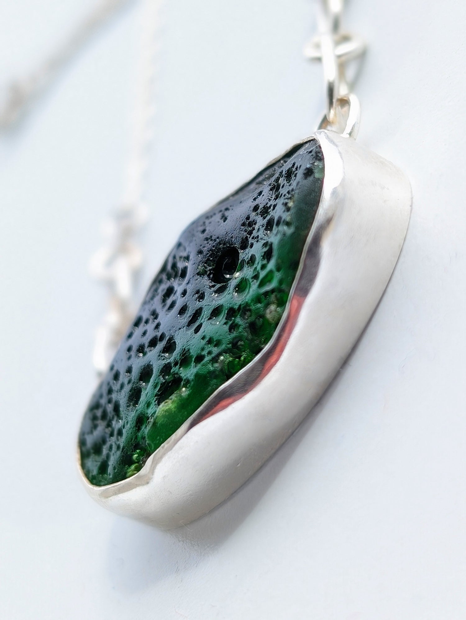 Druzy-style “bonfire sea glass” bezel-set with an open, square-wire back to showcase the bubbles with light. Set in sterling silver with hand-shaped oval links.