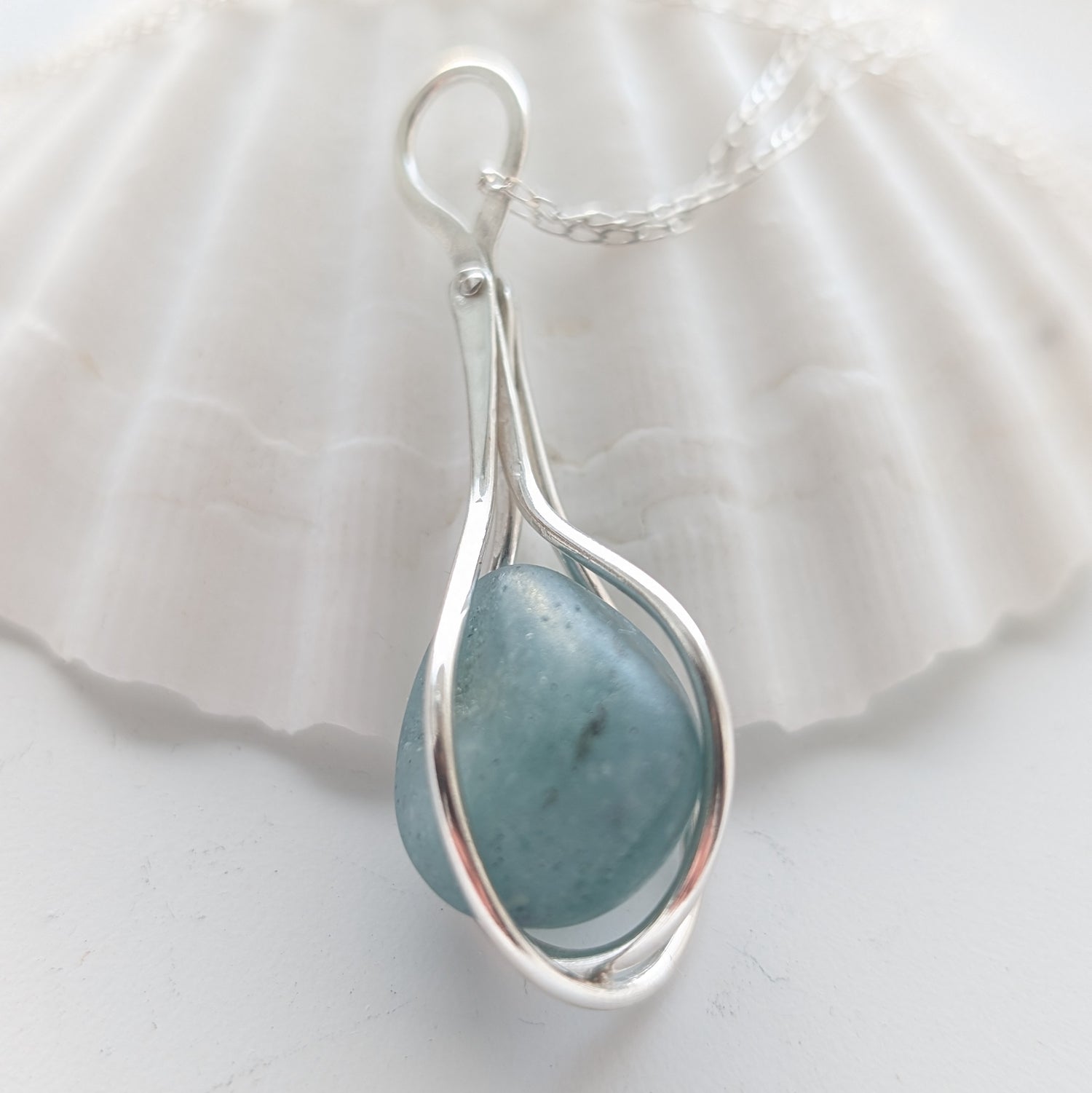 Long-line necklace with Edinburgh seaglass “icy nugget” pendant, housed in a pivoting riveted teardrop cage of recycled sterling silver.