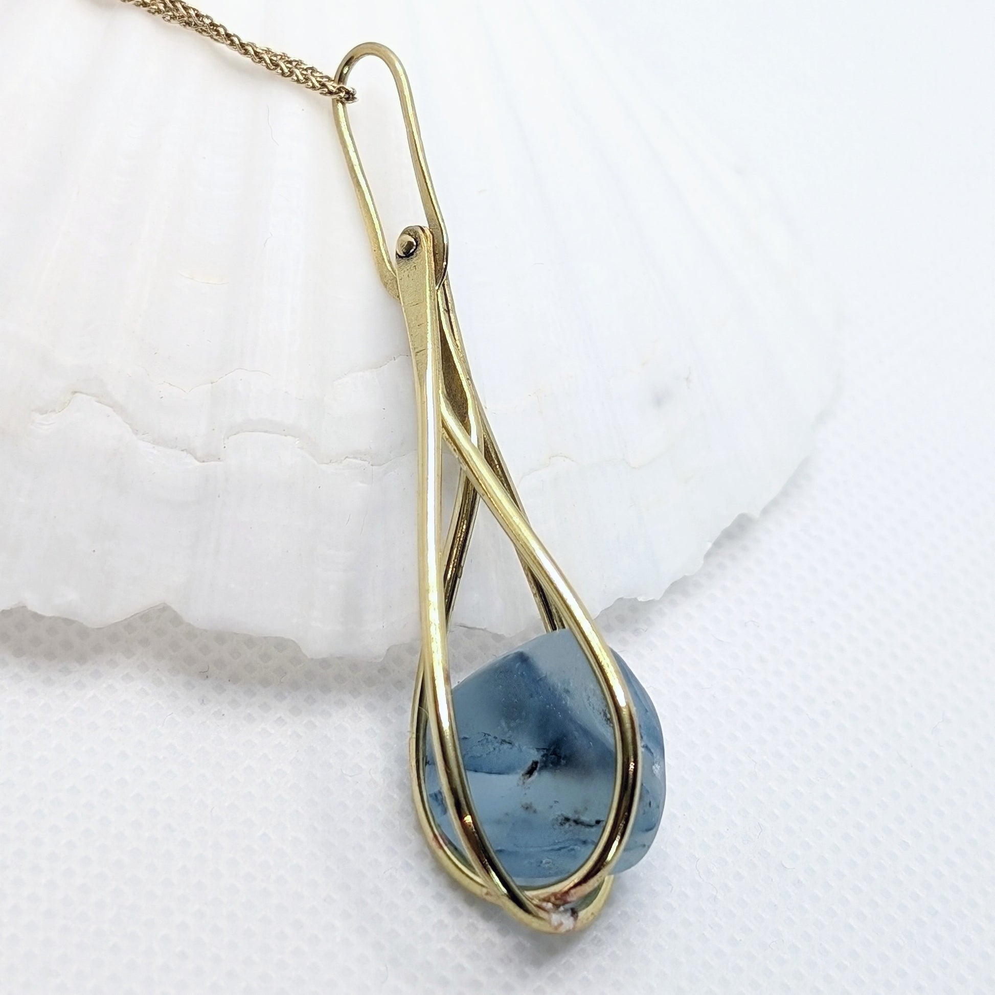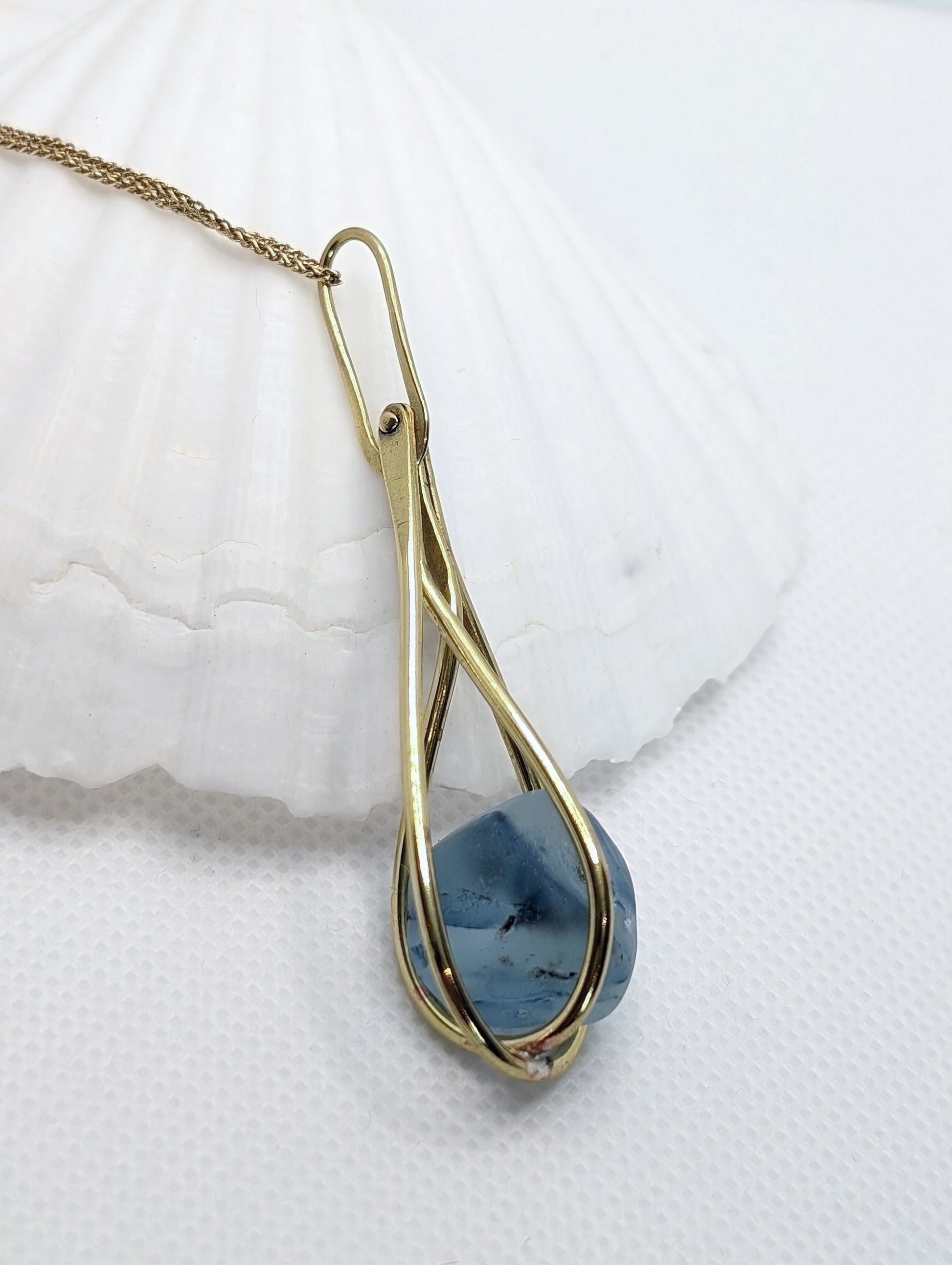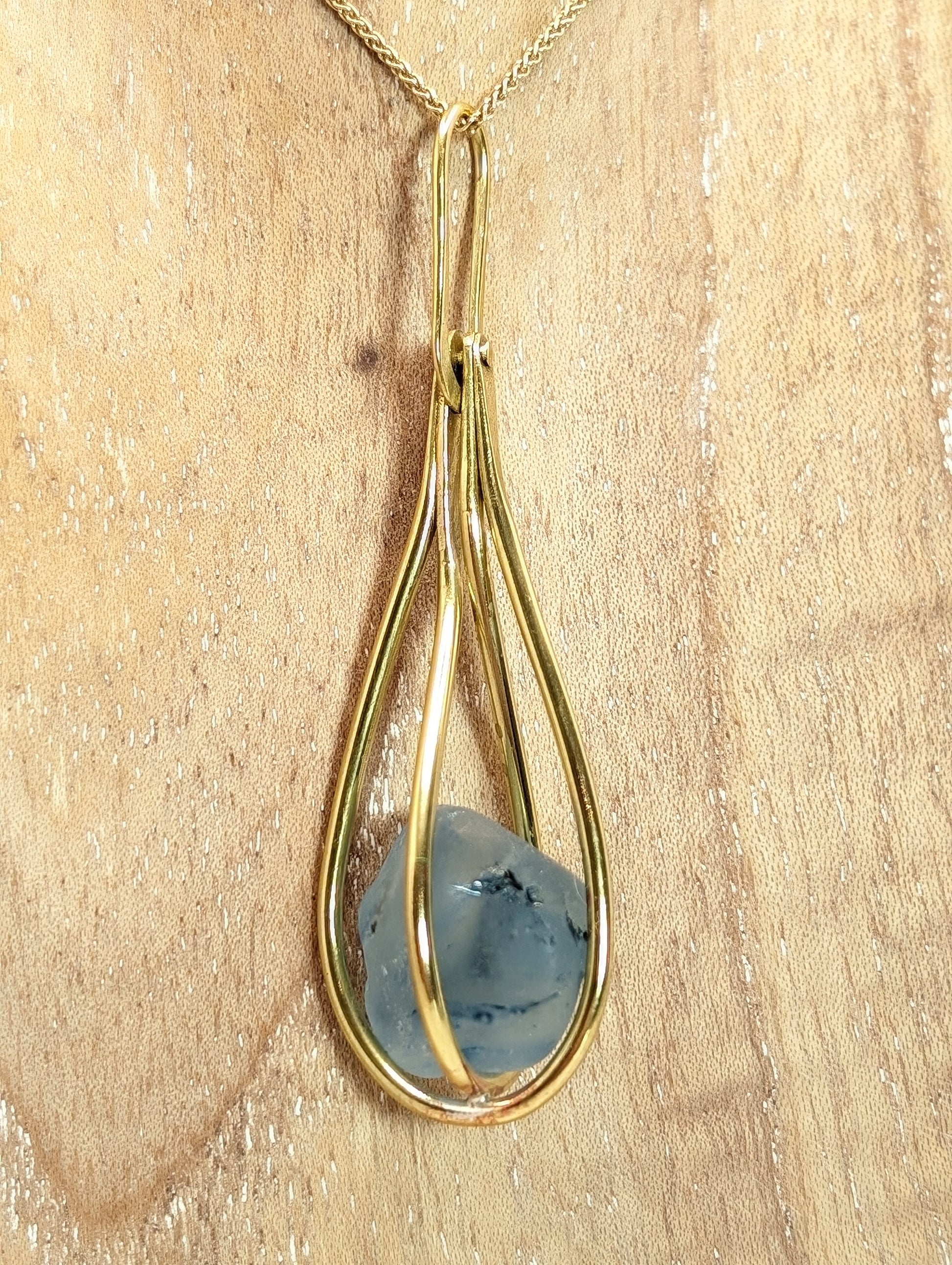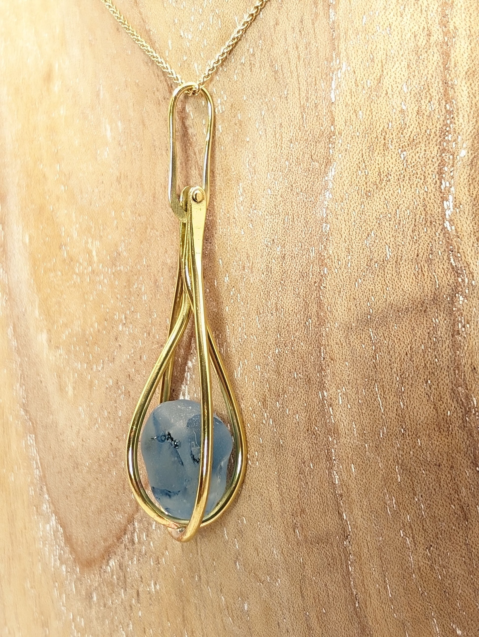 This extremely unusual piece of melted sea glass, showing swirling shades of teal and clear was found on Royston Beach (known locally as "Brick Beach") in Edinburgh. It's been set into a riveted brass cage and mounted on a gold plated 18"/45cm necklace chain.