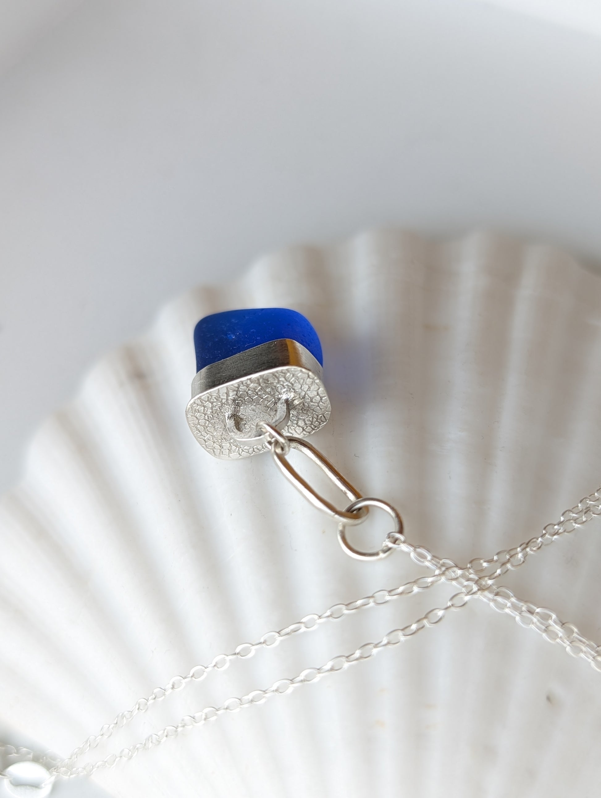 This super unusual and vibrant shade of cobalt blue sea glass features nautical ovals for extra swing and a beautiful organic textured stamp on the top. It's set with a fine silver bezel strip and 100% recycled sterling silver top and chain. Comes with a 18"/45cm sterling silver necklace chain.