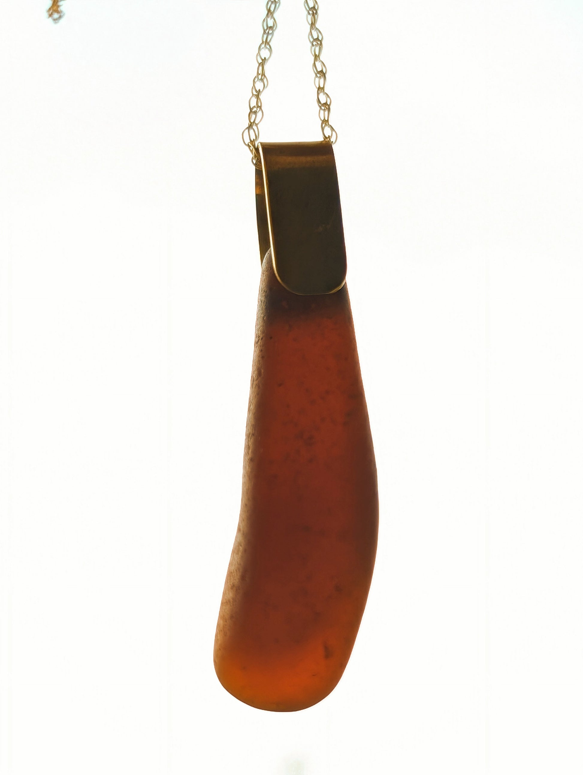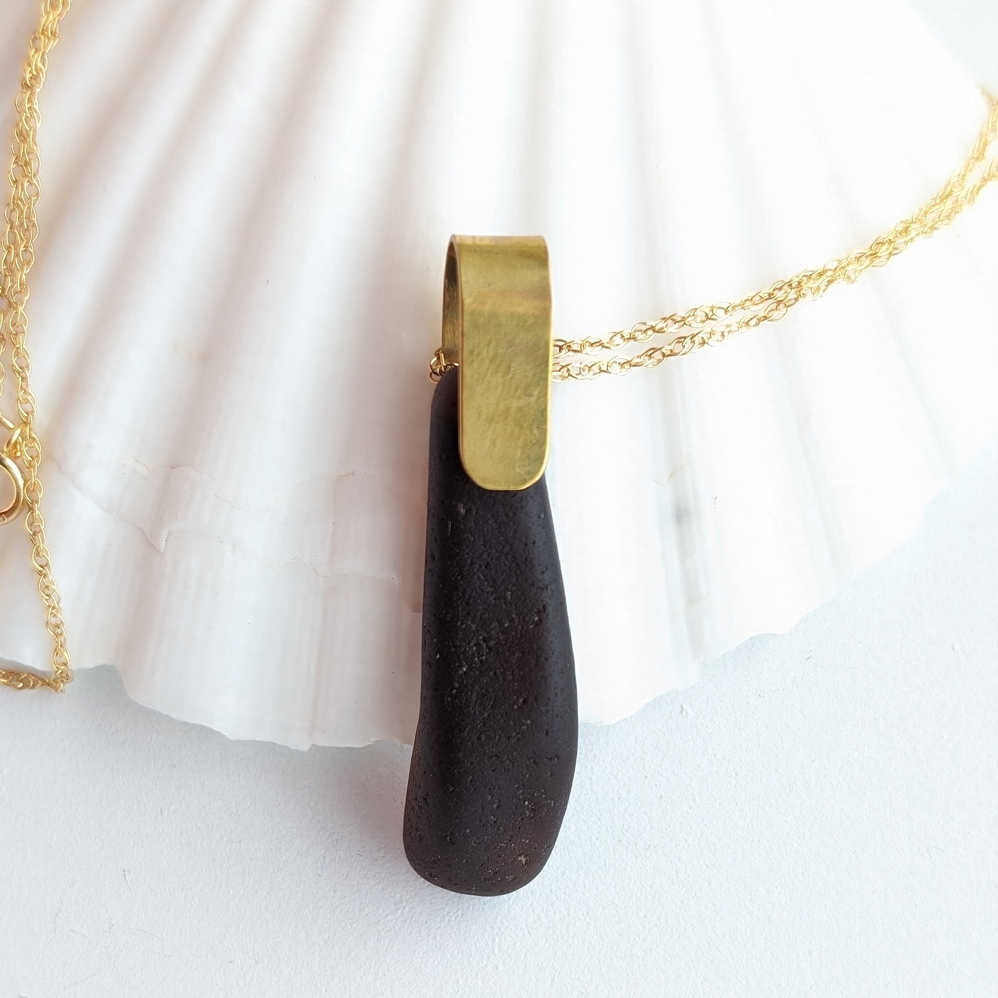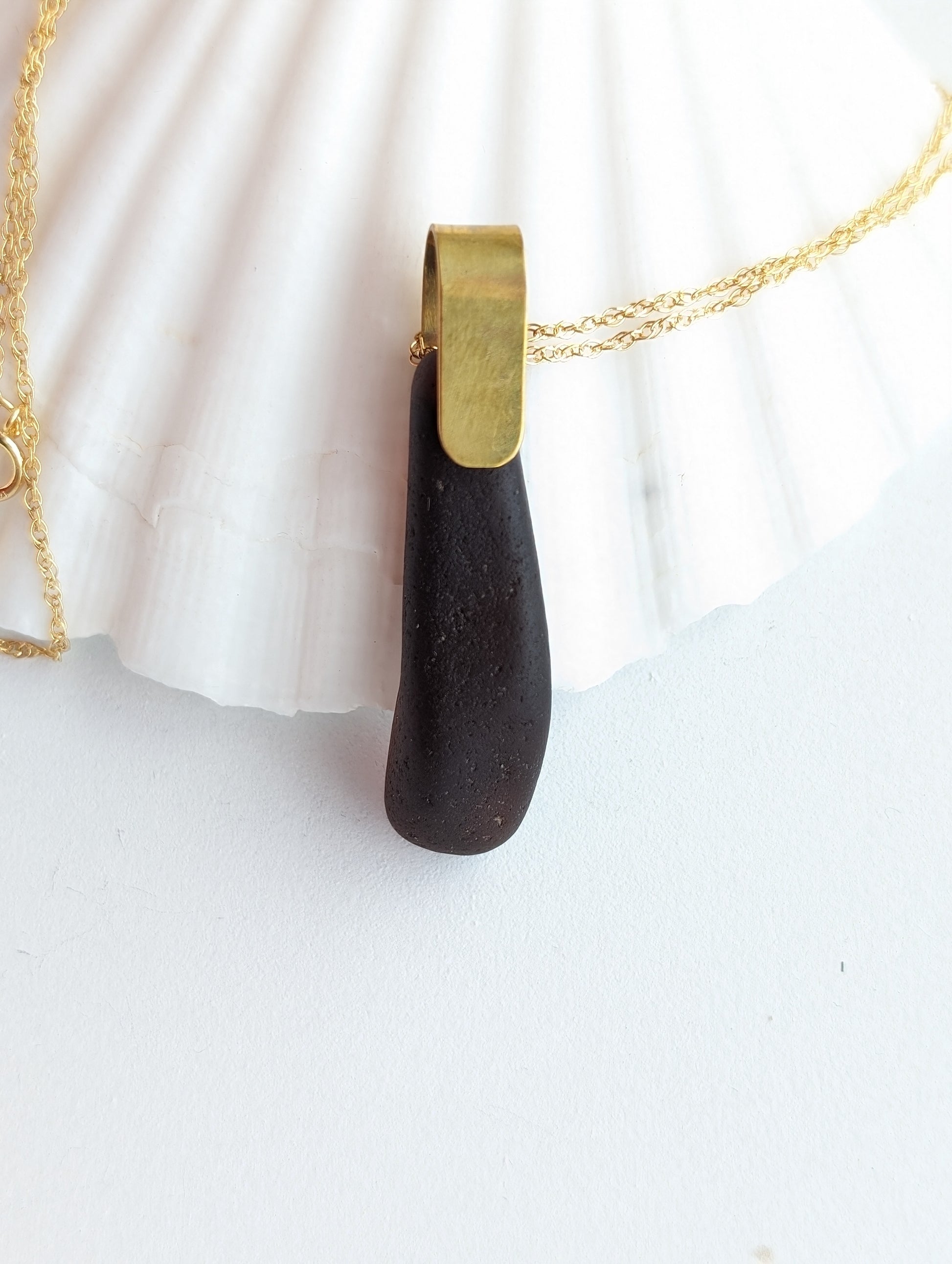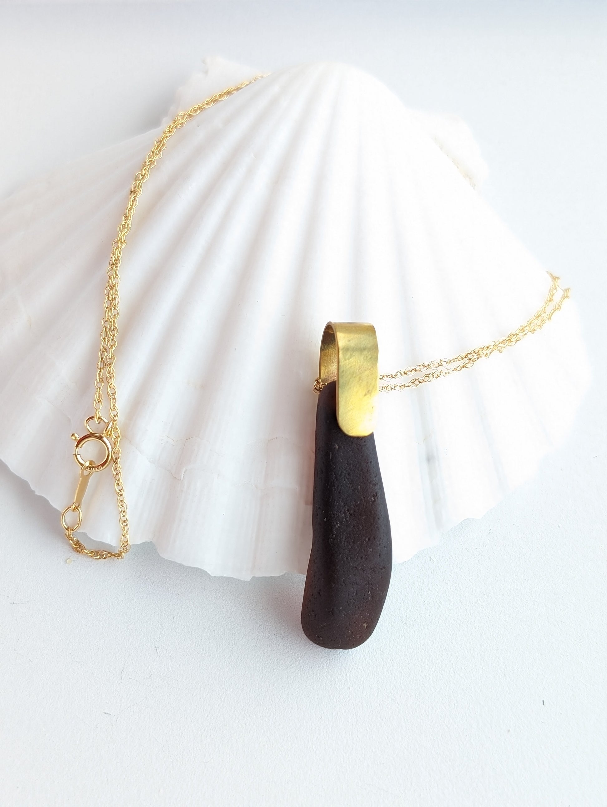 This minimalist dark brown sea glass is from Wardie Bay Beach, Edinburgh. It has been drilled and mounted with a hand-cut brass bail and placed on an 18"/45cm gold plated chain.