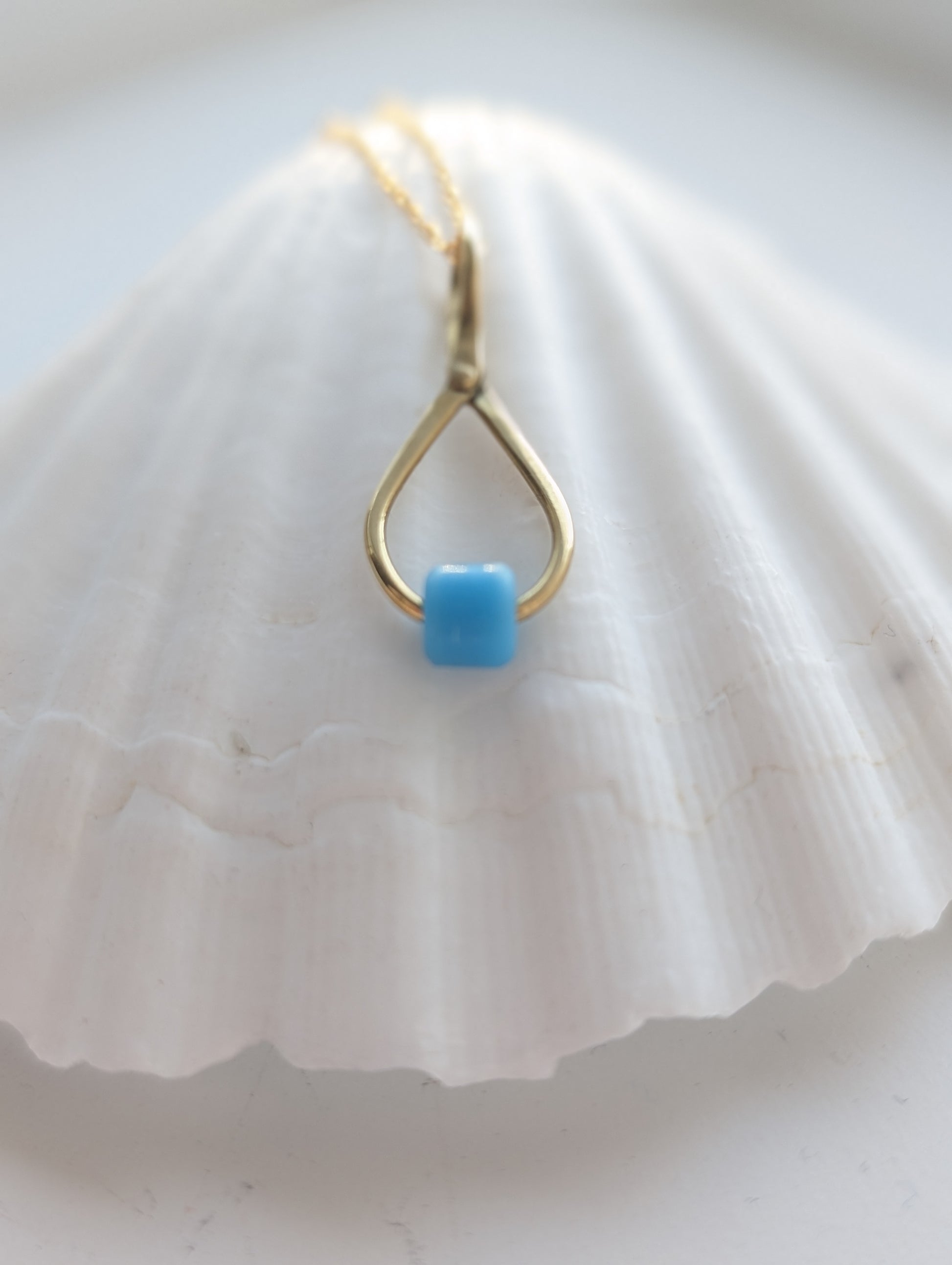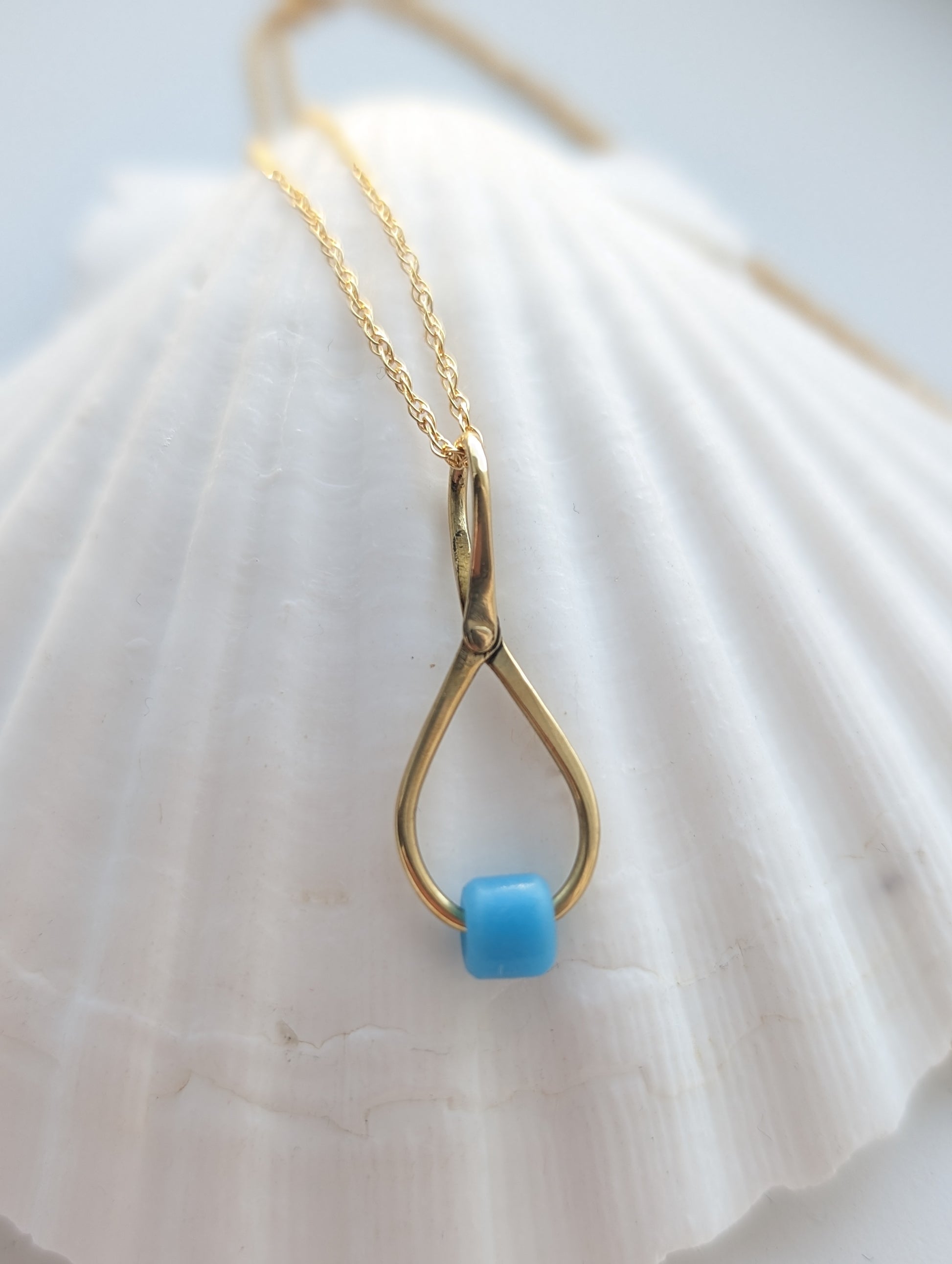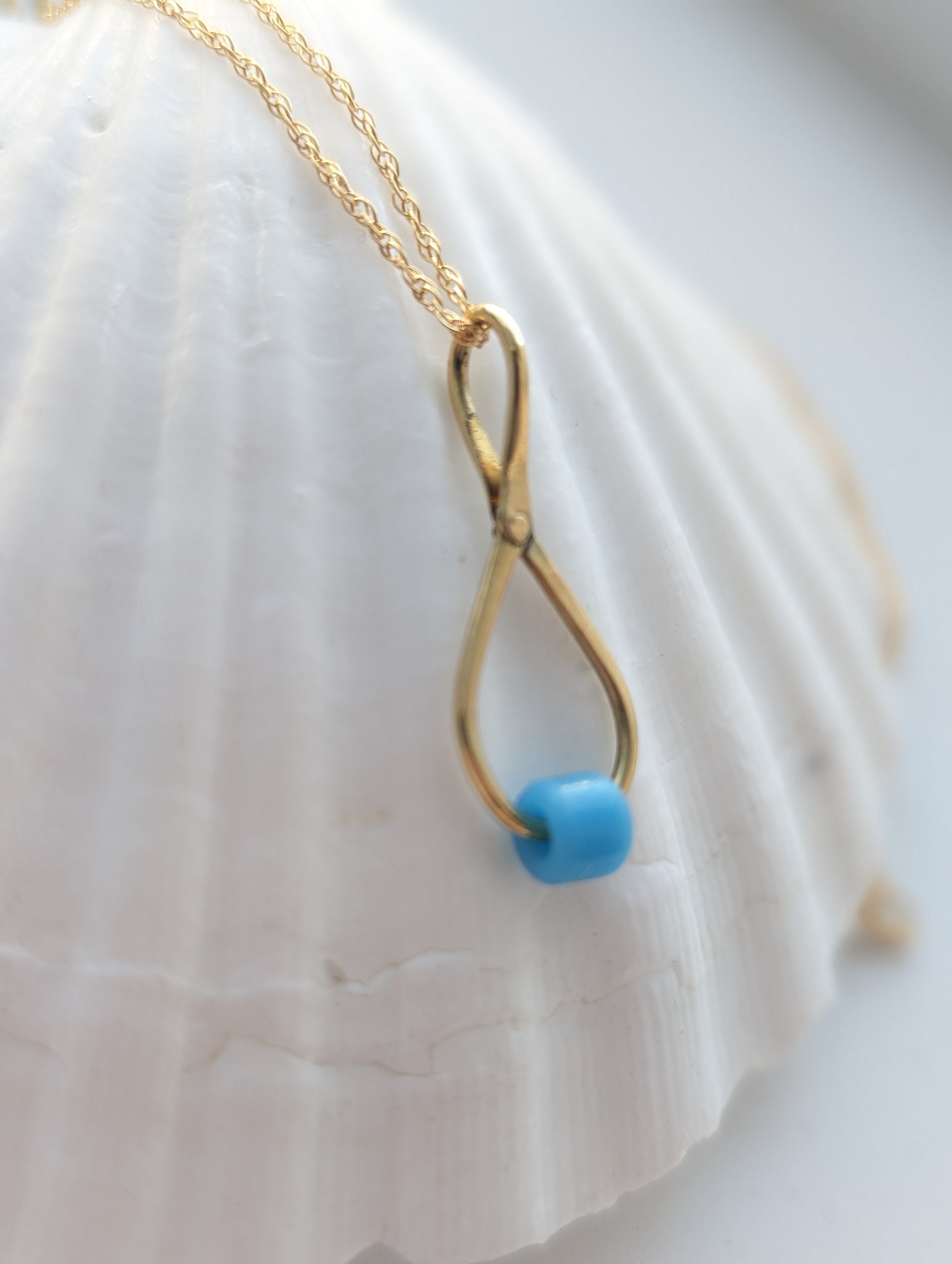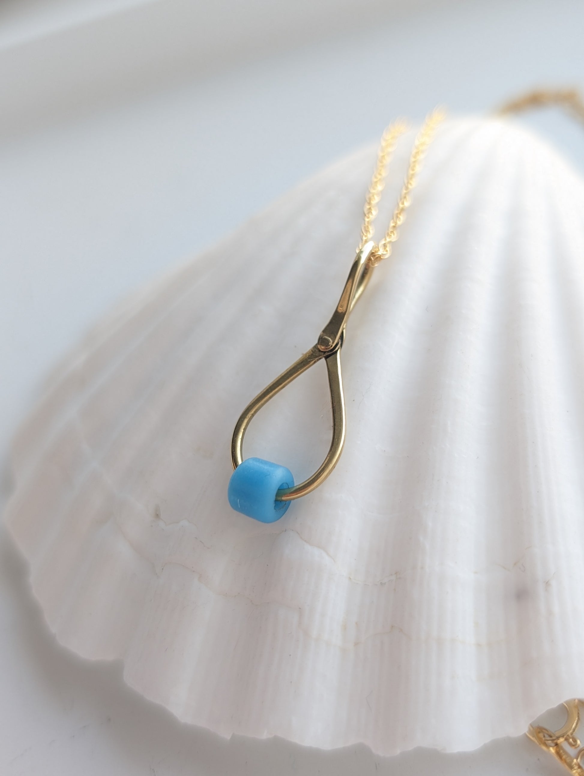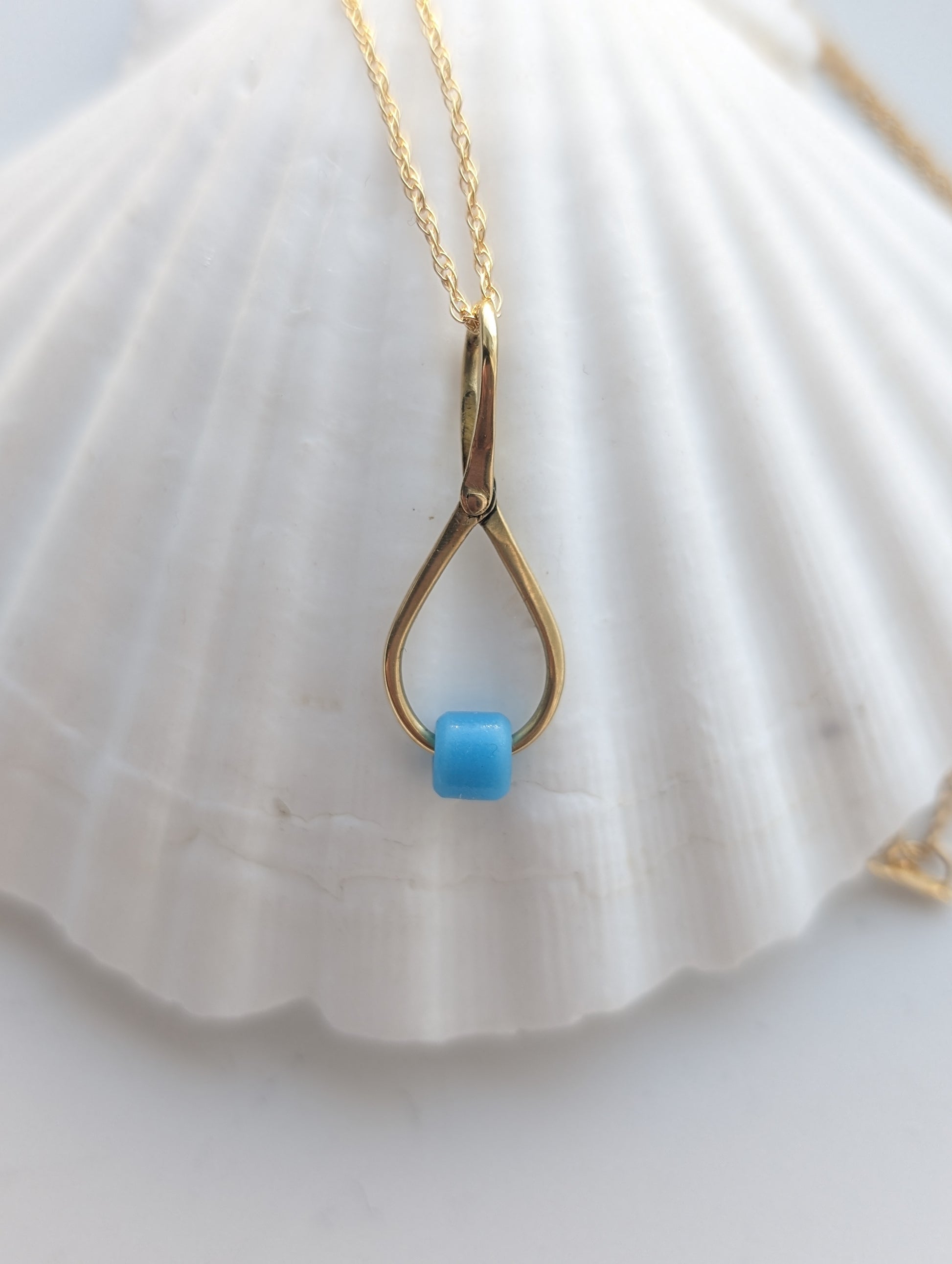 Charming blue glass sea bead - possibly vintage or antique - recovered from the sand on Royston Beach (known locally as "Brick Beach") in Edinburgh. It has been threaded onto hand riveted brass wires in a twisted infinity shape, and mounted onto an 18"/45cm gold plated necklace.