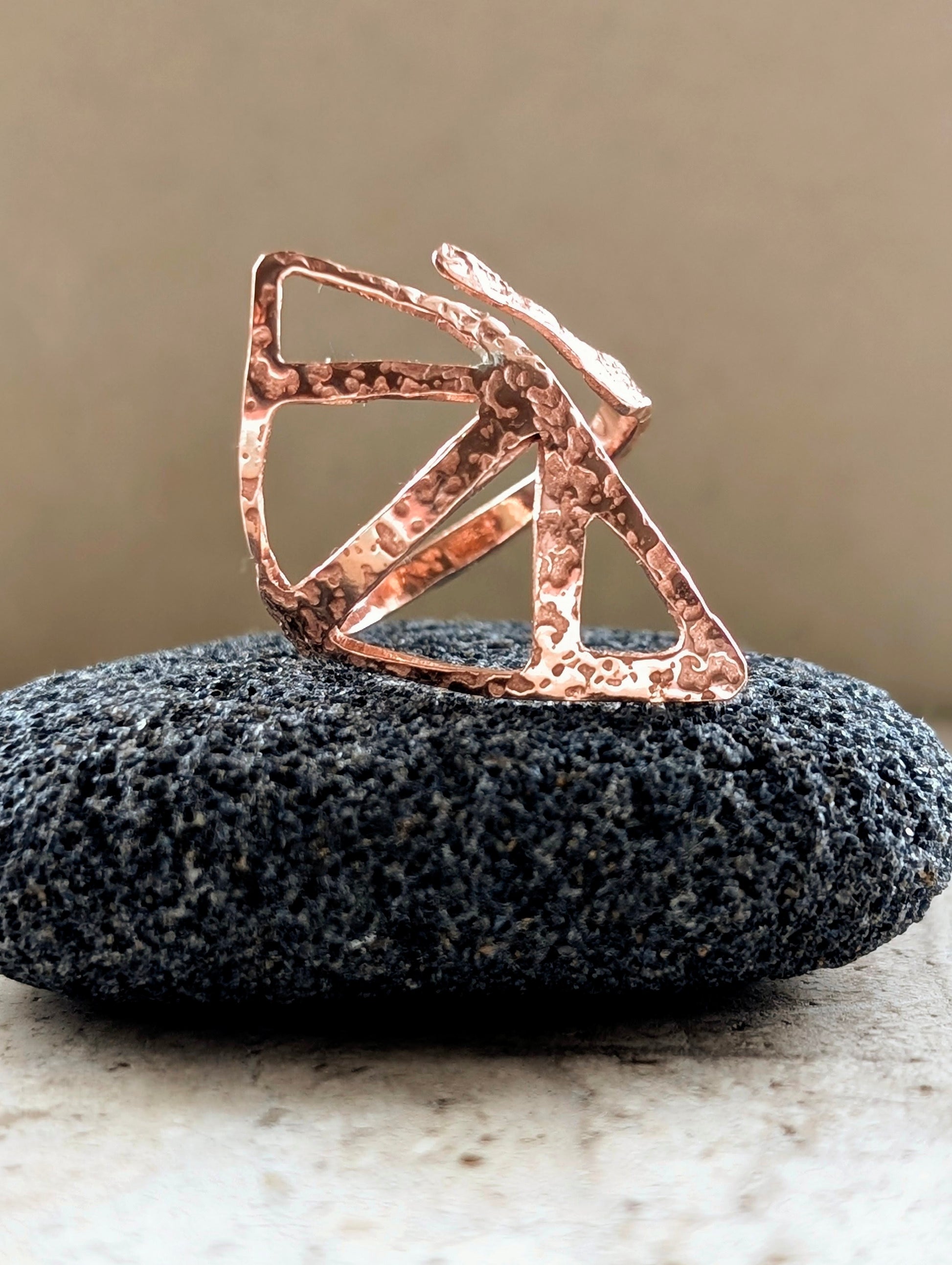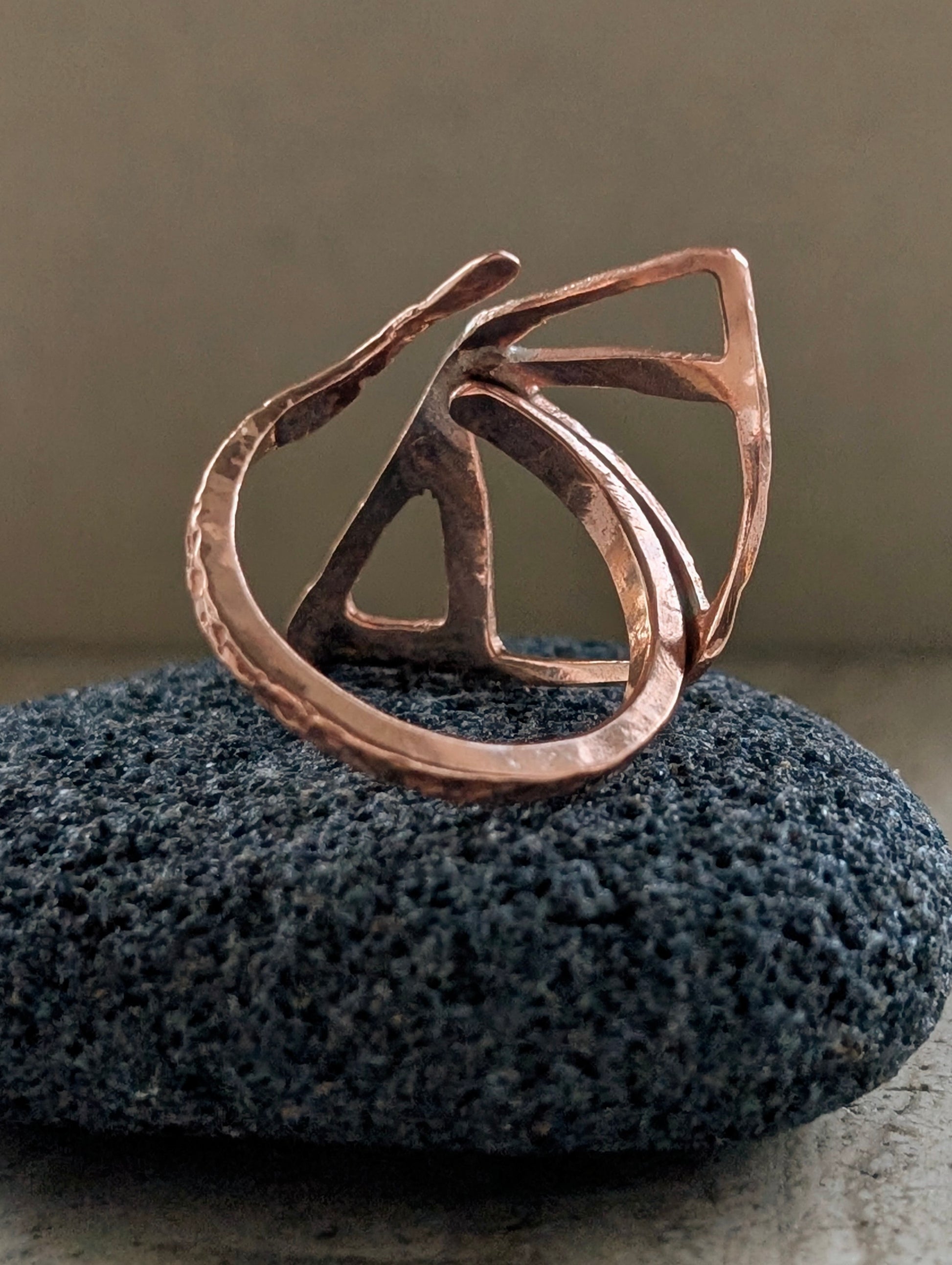 This copper ring is inspired by the shapes in a butterfly wing, and the texture has been stamped in a way to emulated the corroded texture of sea-worn metal. The copper wire used to make this ring was reclaimed from construction waste. This is an adjustable ring in a larger size.