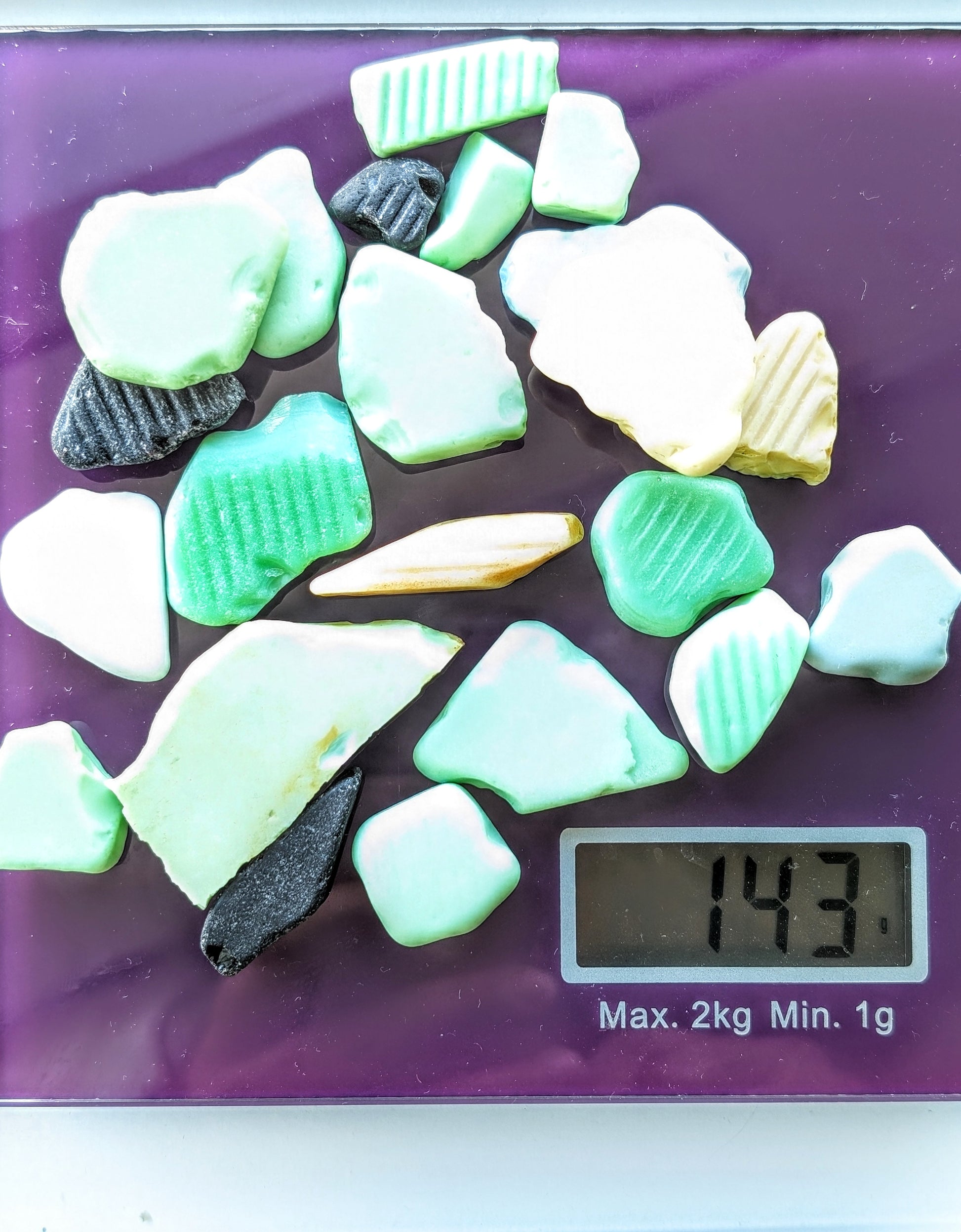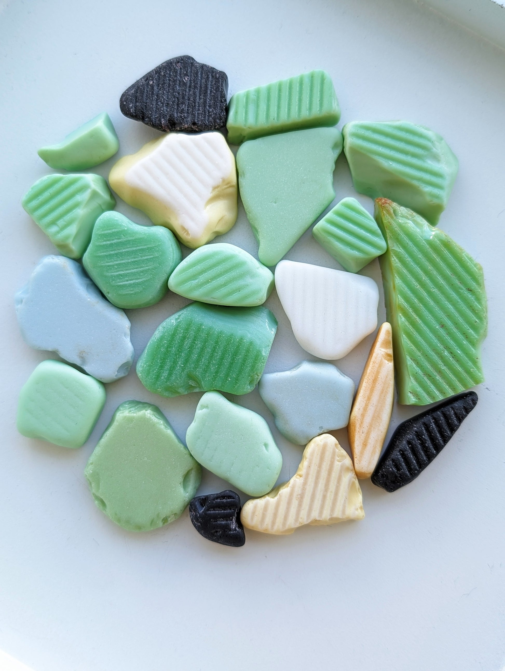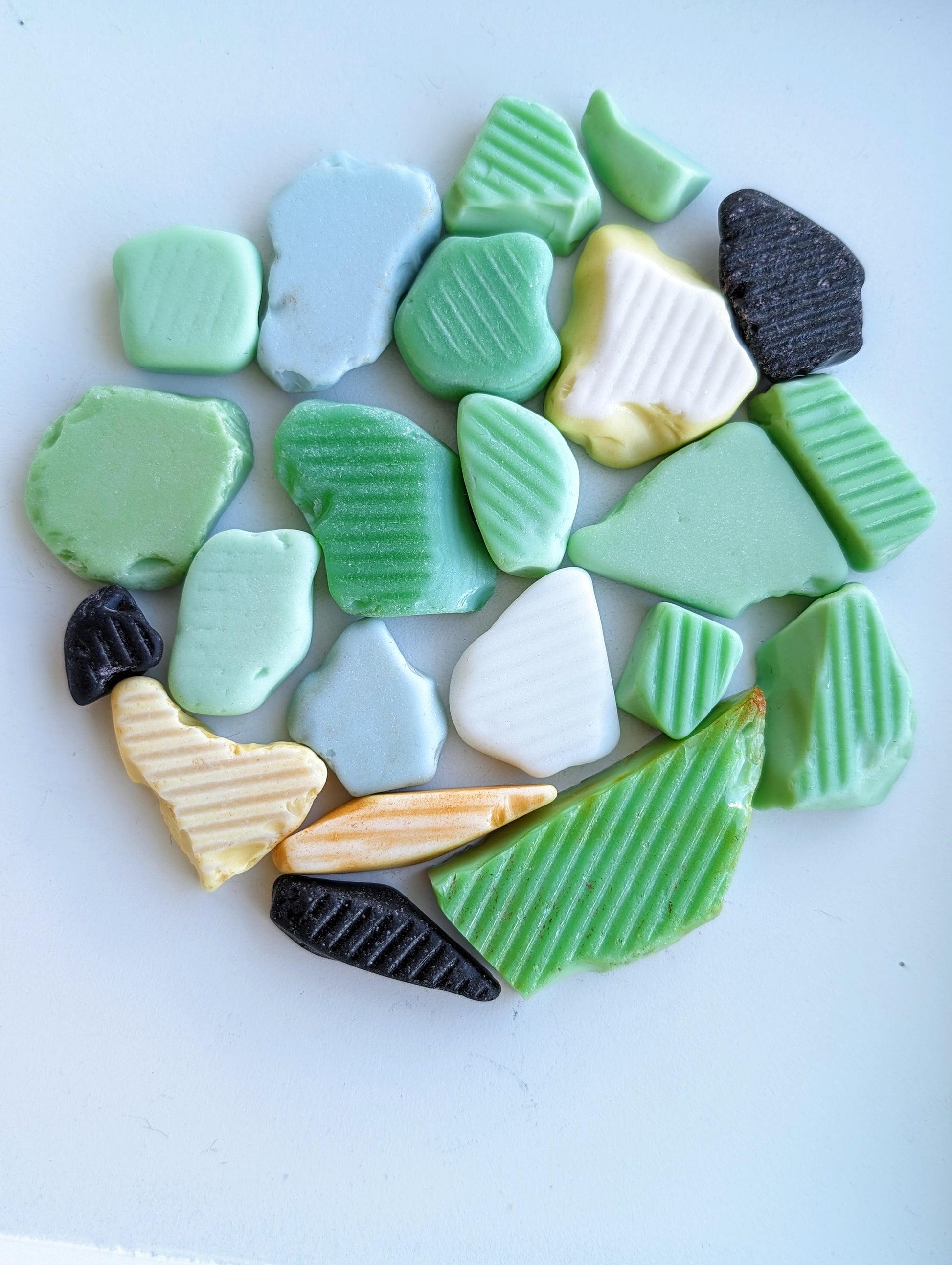 Mixed Vitrolite bundle. Includes blue, green, yellow, white & black vitrolite. All washed up in Edinburgh, Scotland.
