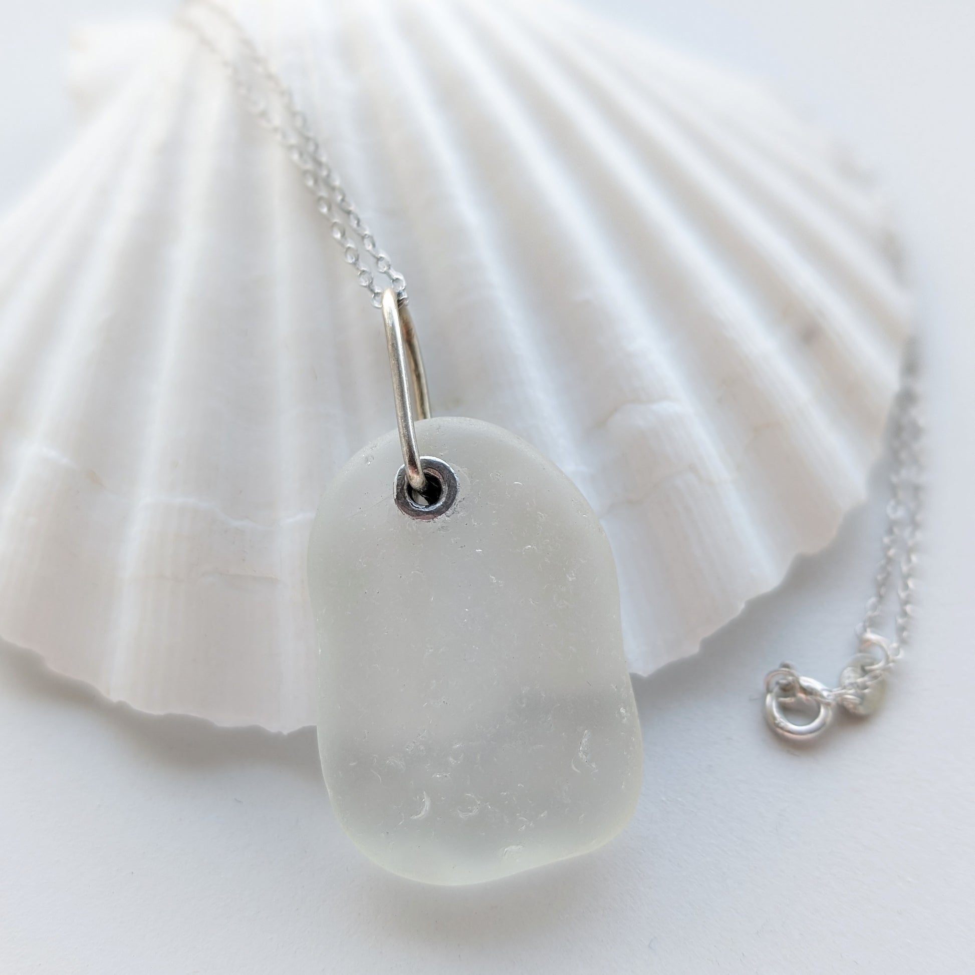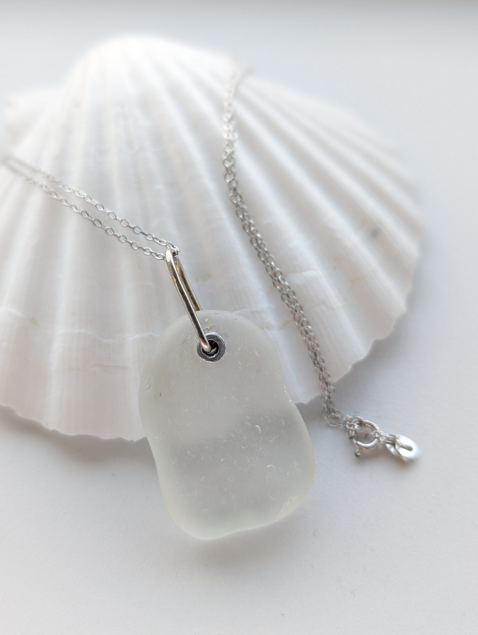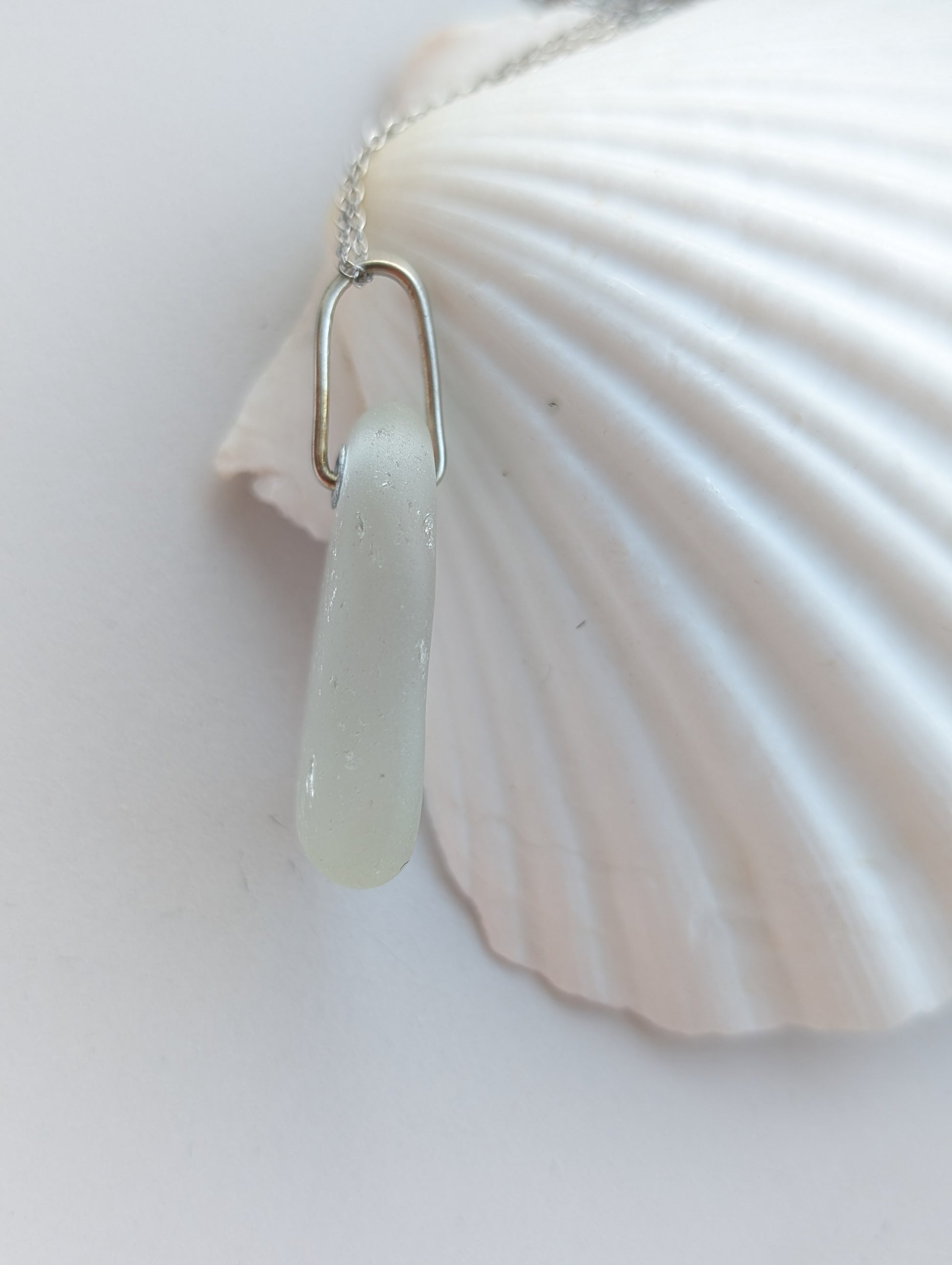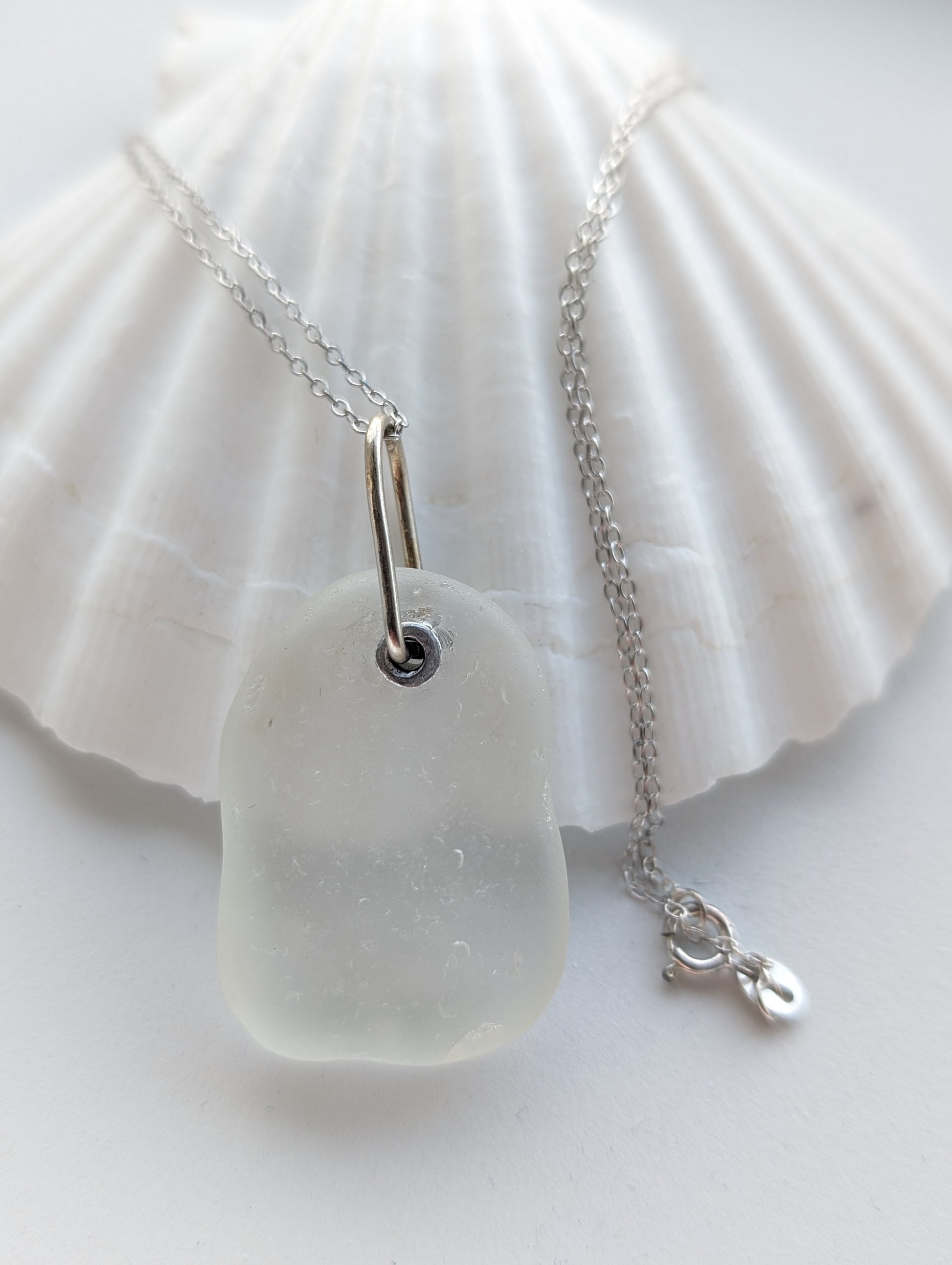 This piece of sea-tumbled glass was found washed up at Wardie Bay, Granton, Edinburgh. It's been drilled and riveted with aluminium tubing, mounted on a sterling silver bail, on a 18"/45cm sterling silver chain.