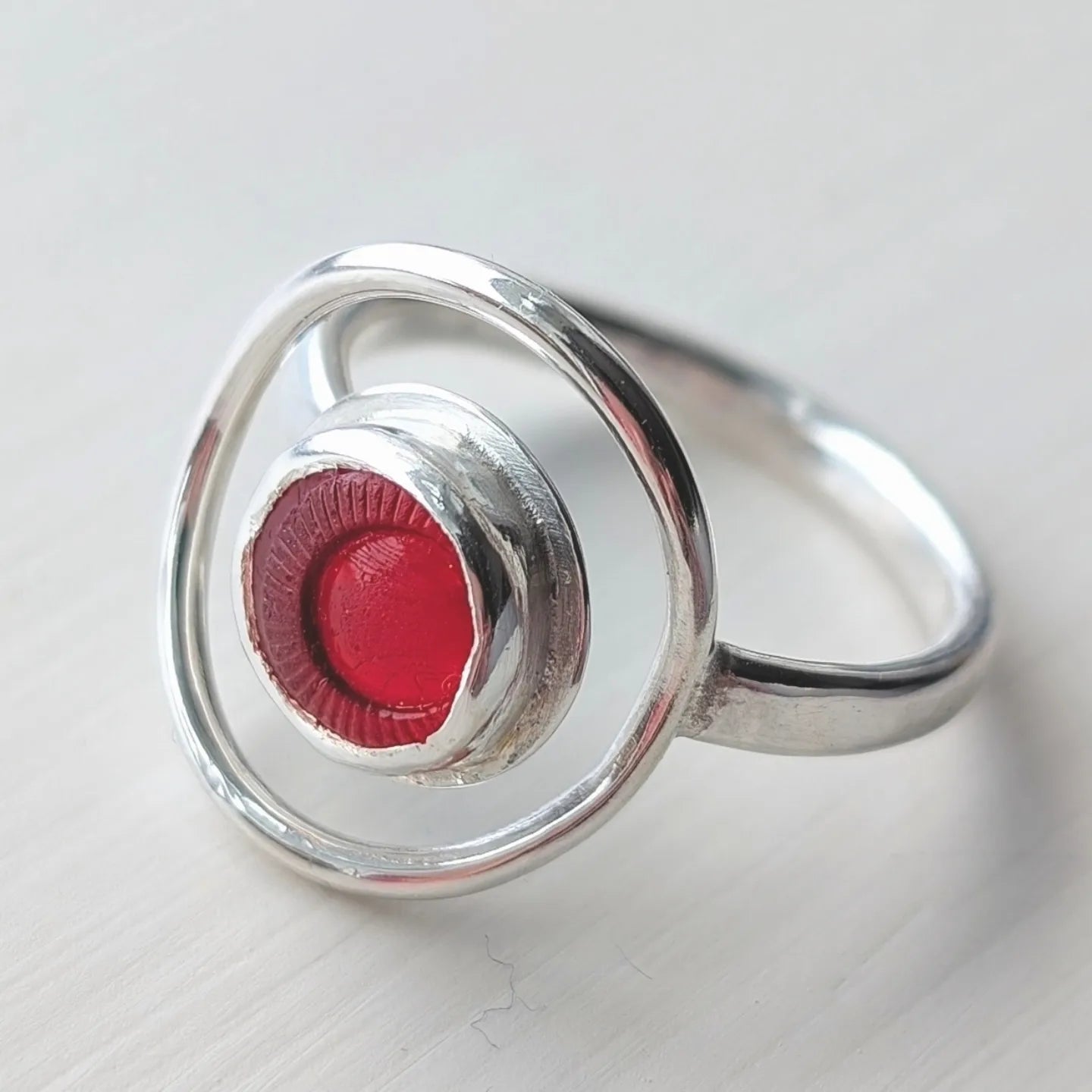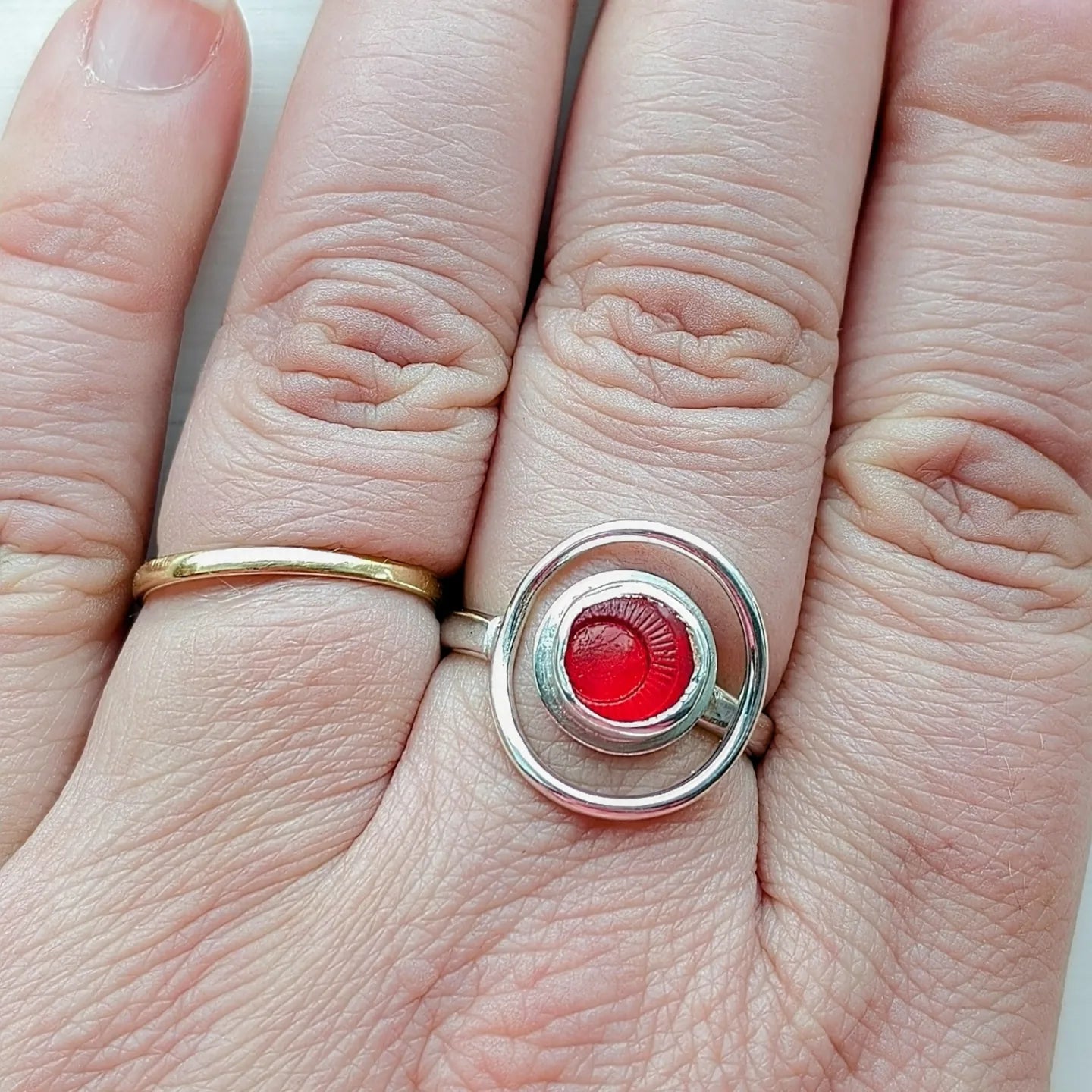 This silver adjustable ring (see the picture of the back of it to see how it adjusts) is built around a stunning little red glass button found on Royston Beach, Granton - Edinburgh. The back on the glass button back has been ground flat and set into a fine silver bezel cup. The 100% recycled sterling silver oval ring shank has a lightly hammered texture for a more organic feel. The button design echoes that of a solar eclipse - with the moon passing across the light of the sun - which inspired it's movable placement within a larger ring - symbolising the "Spirit" element. Although it's adjustable, it's best suited to a medium - large finger size.