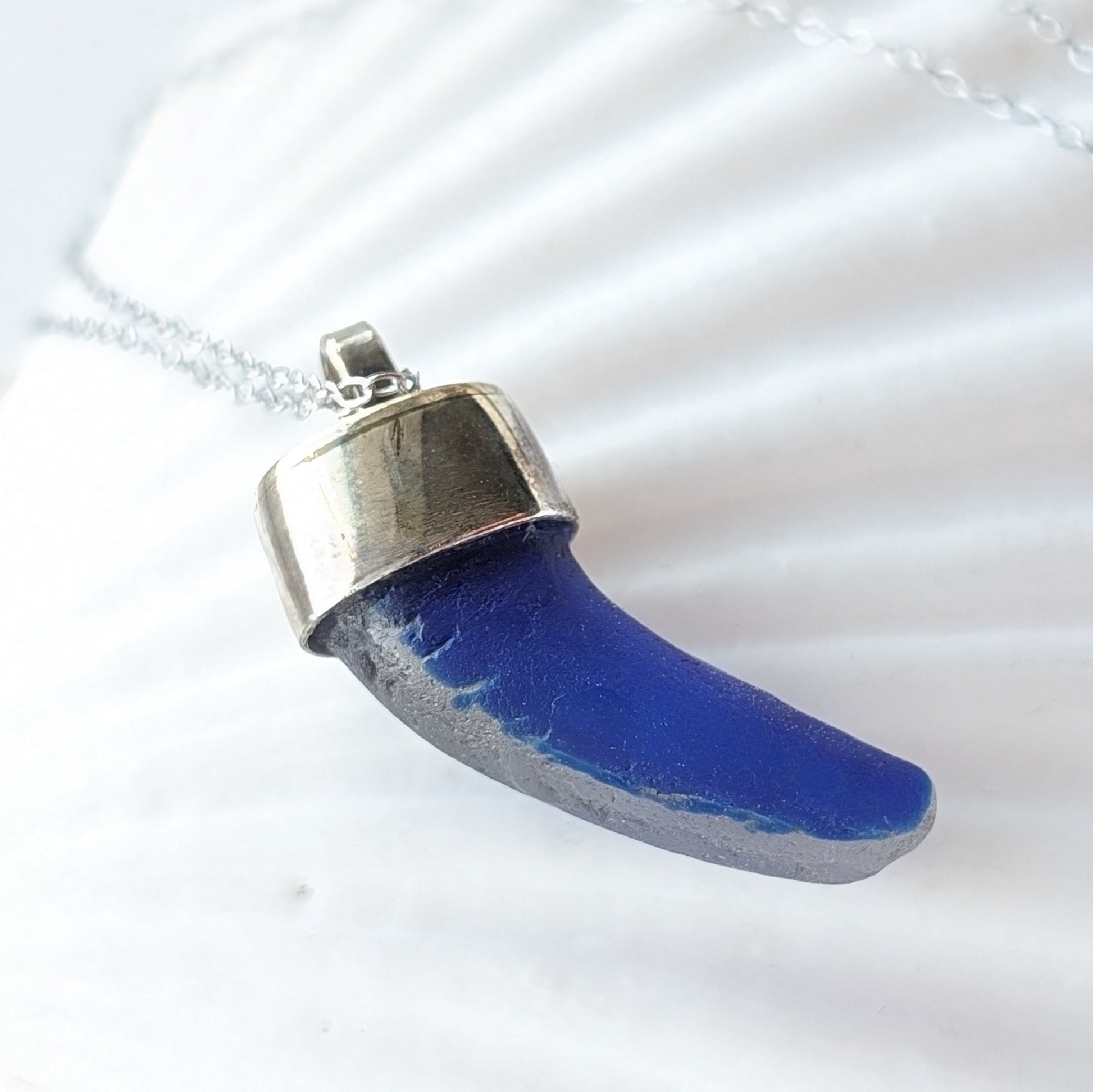 This unusual blue "multi" glass tusk washed up on Royston Beach (known locally as "Brick Beach") in Edinburgh. The pendant is set in sterling silver and placed on a 18"/45cm sterling silver chain.