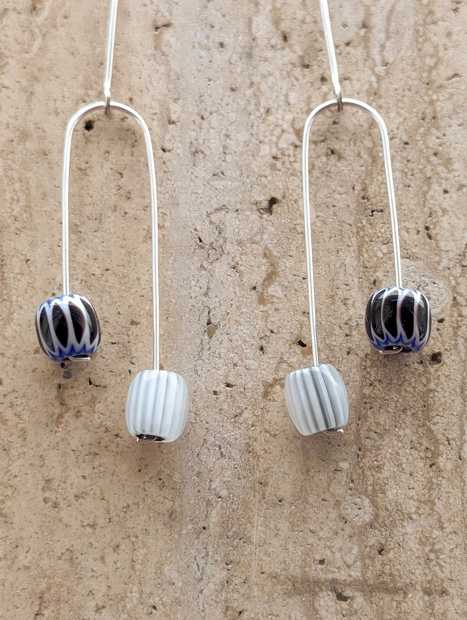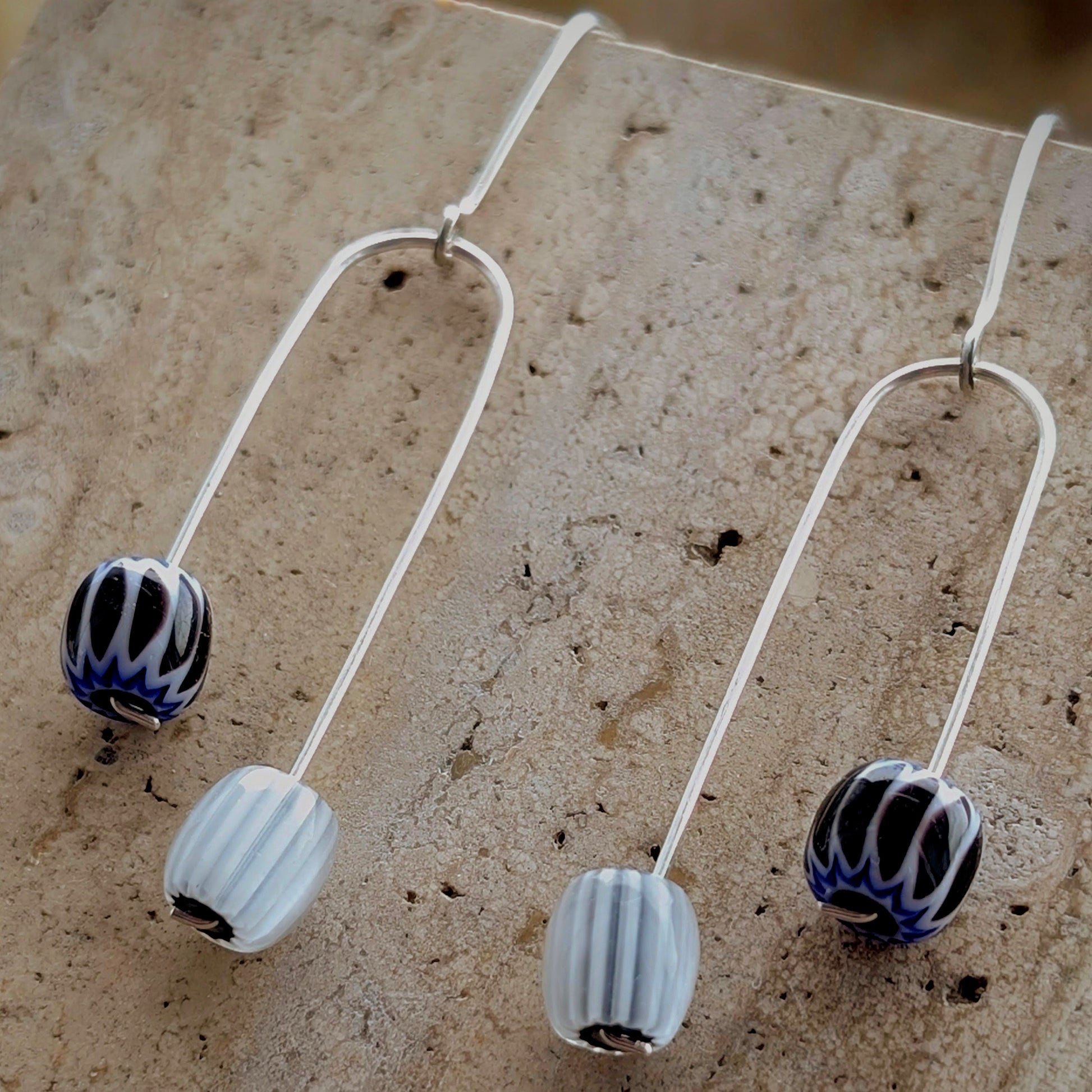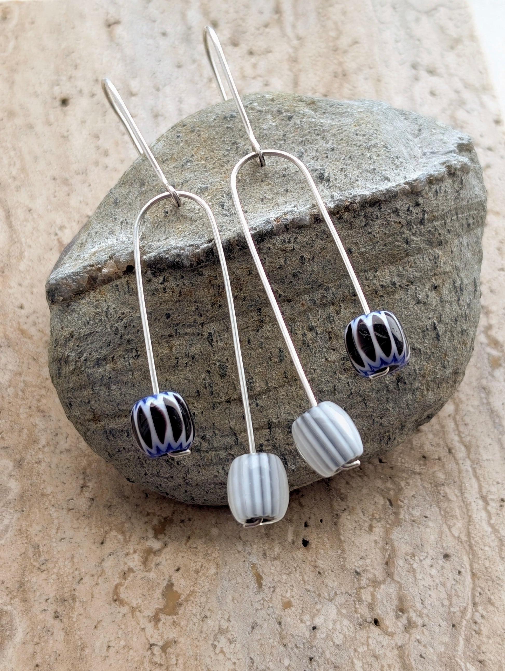 Minimalist sterling silver wire earrings with grey and black glass beads, made with 100% recycled silver.