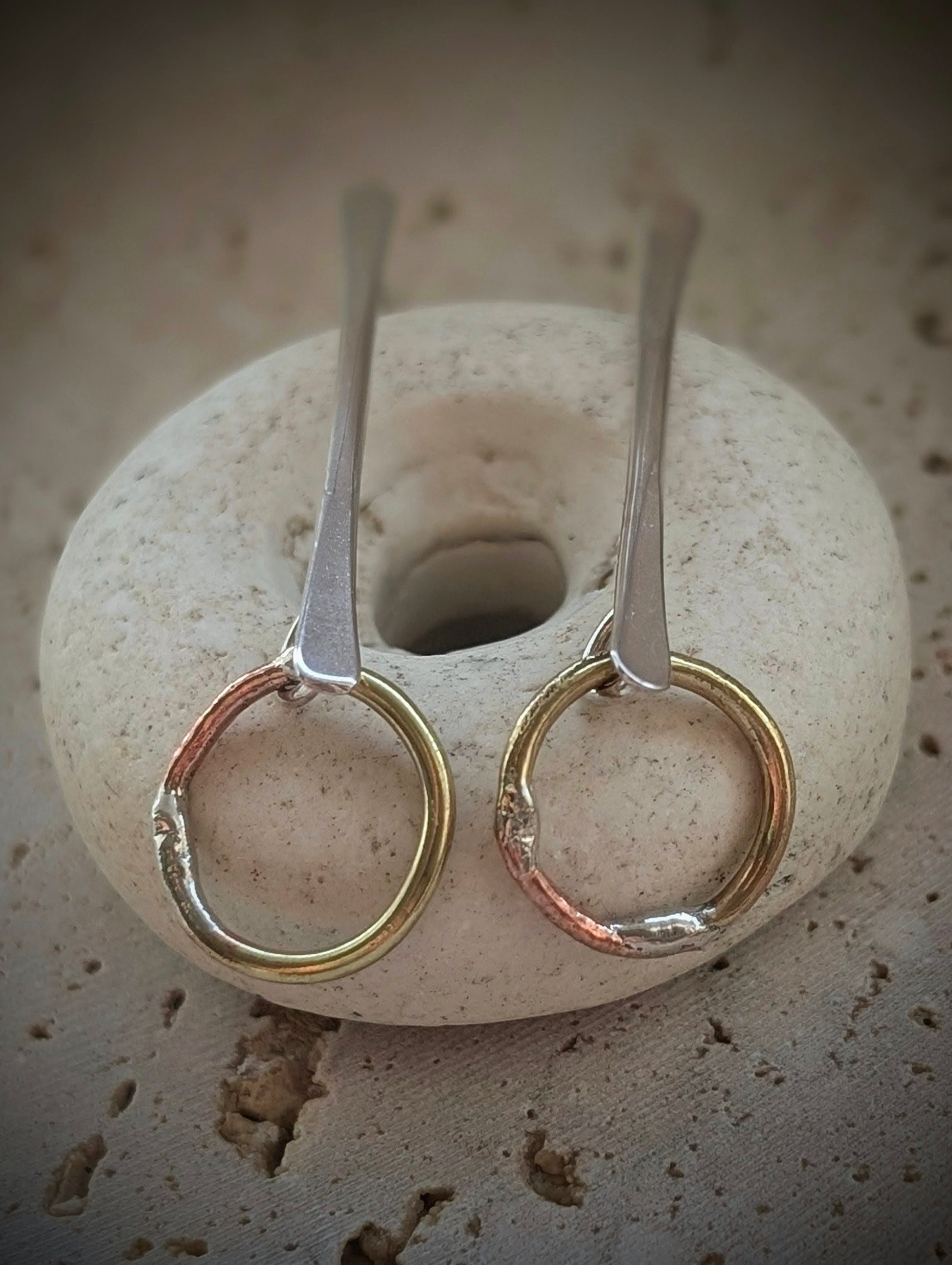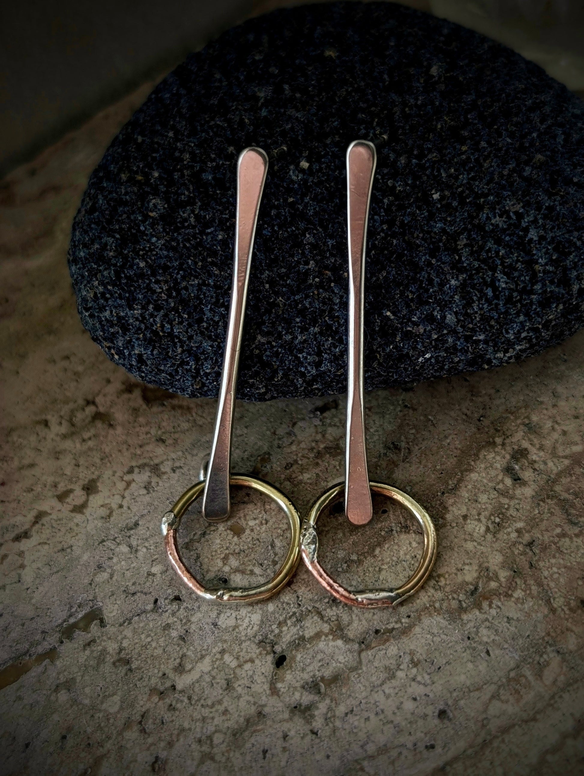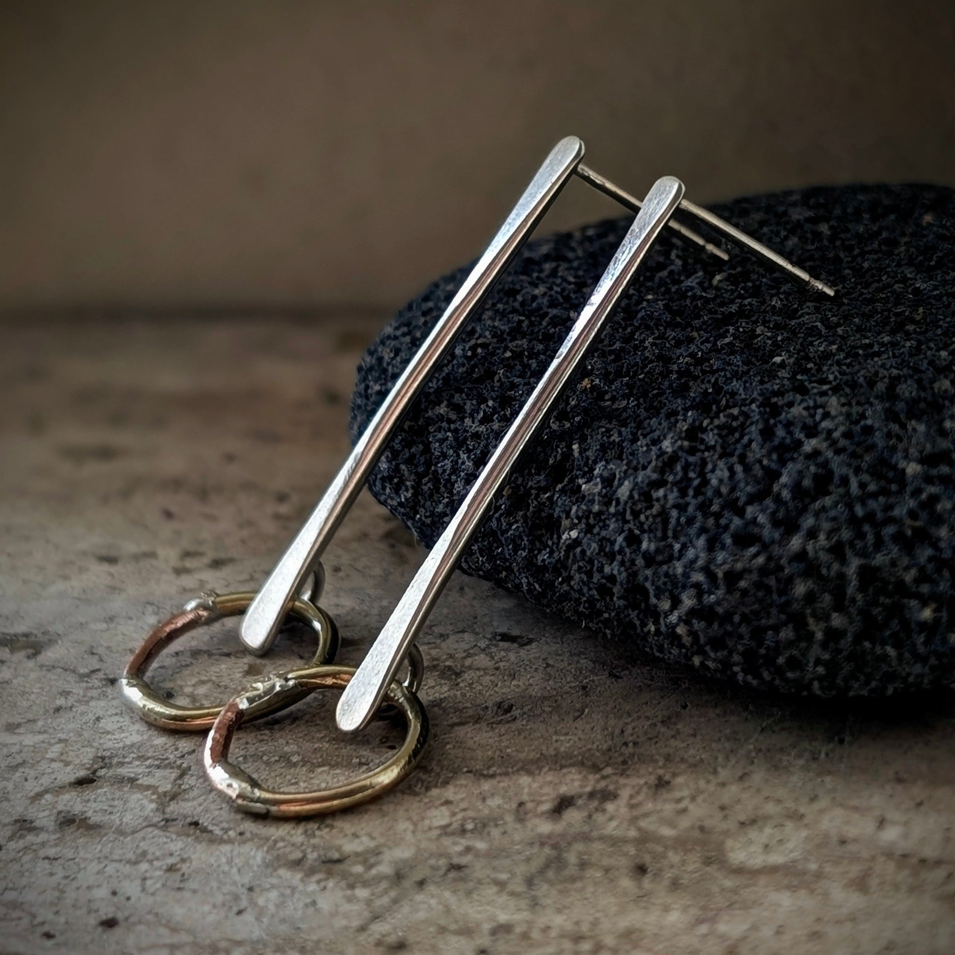 These elegant mixed-metal earrings are inspired by the Japanese art of Kintsugi - the little suspended hoops celebrate the beauty of joining broken things - reflected in the joins being made with joyful, oversized blobs of silver. The elongated sterling silver bars that suspend the tiny hoops are made with 100% recycled silver. The little hoops are made with waste brass wire and washed-up copper electrical wire.