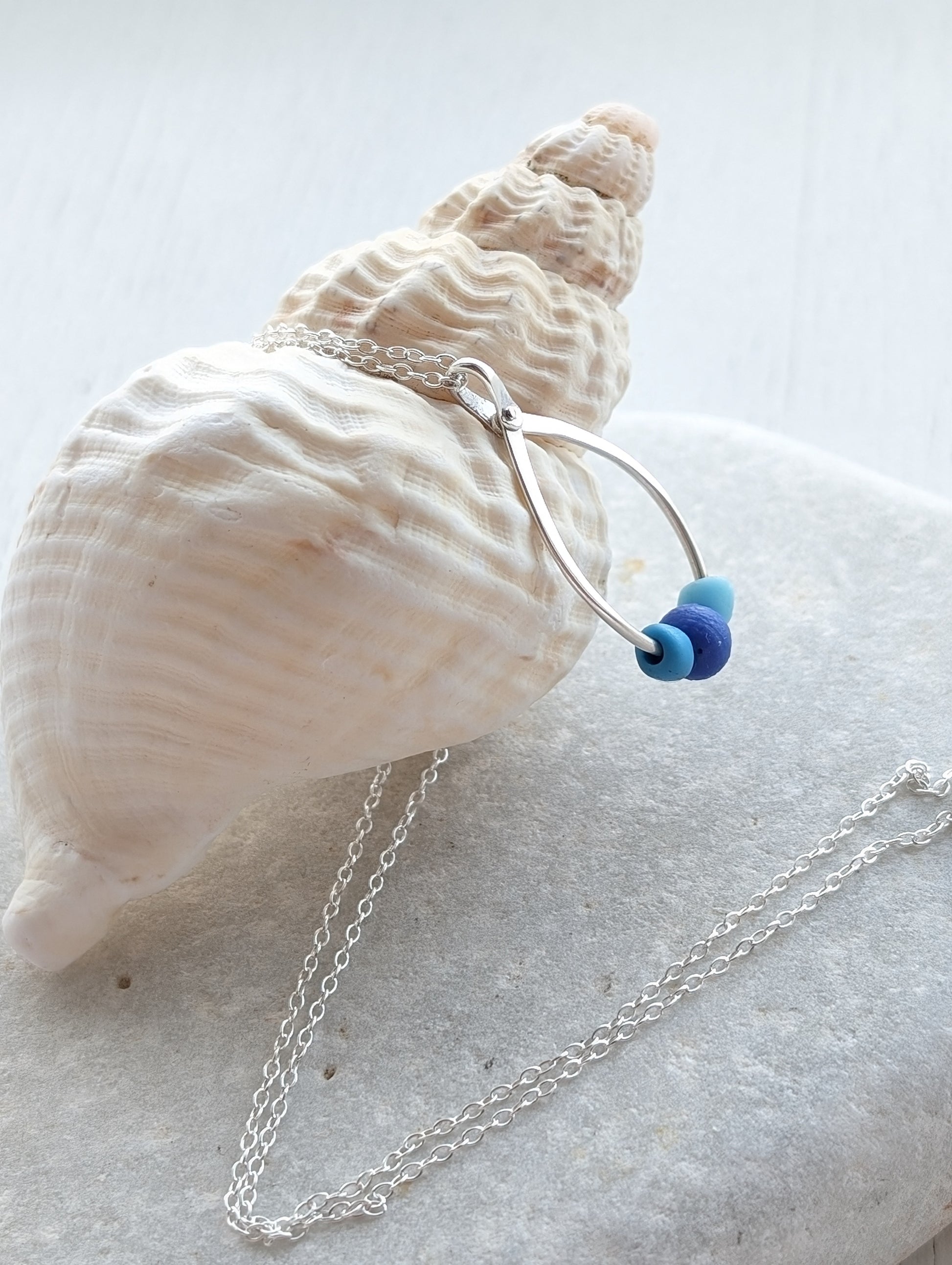Charming blue glass sea beads - possibly vintage (1950s at the latest) or antique - recovered from the sand on Royston Beach (known locally as "Brick Beach") in Edinburgh. They have been threaded onto hand riveted sterling silver wire in a twisted infinity shape, and mounted onto an 18"/45cm sterling silver necklace.