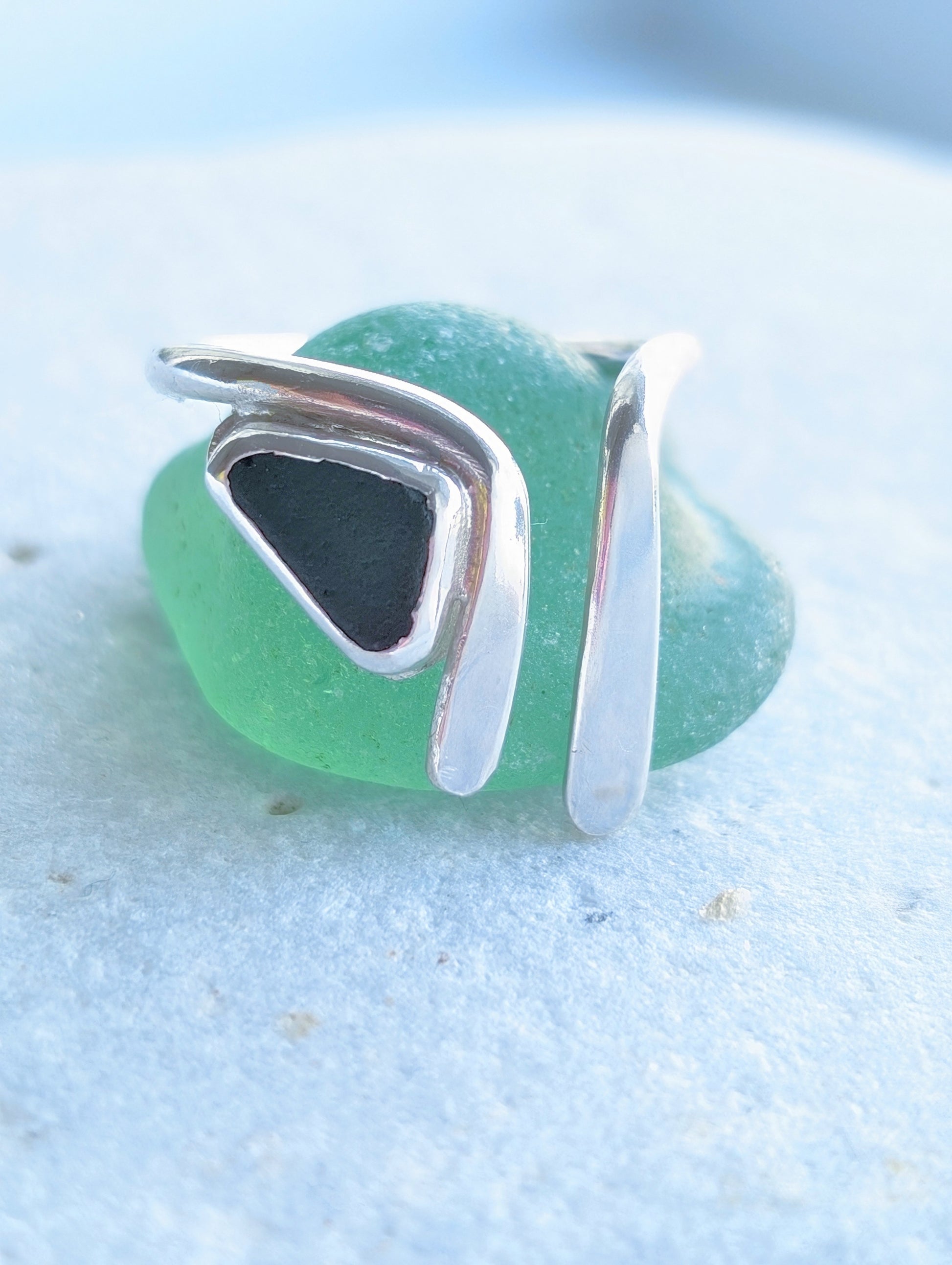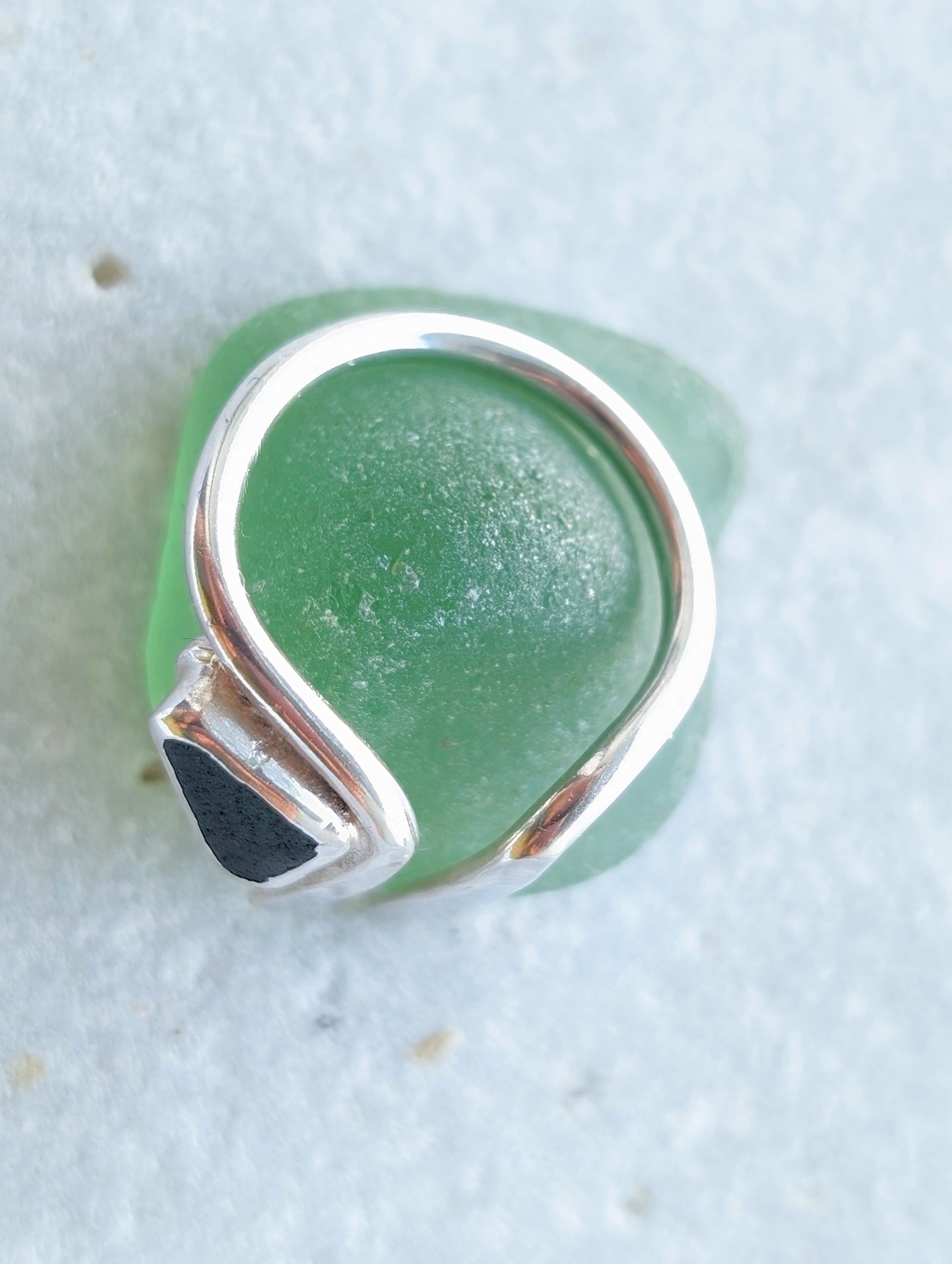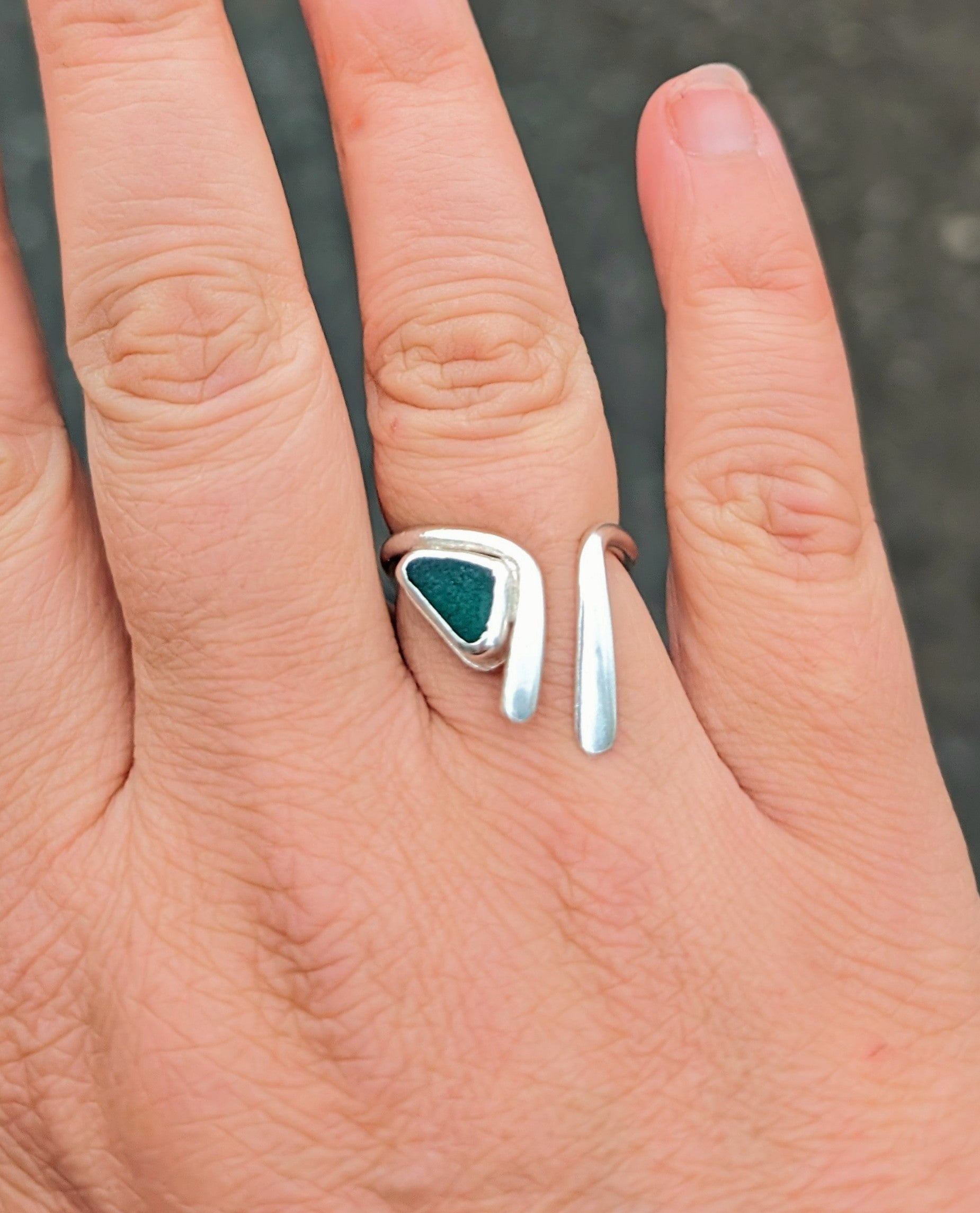 This silver adjustable ring is built around a really unusual shade of green - like gazing into the deepest parts of the ocean. This little shard of fused glass (green on the front and white on the back) was found on Royston Beach (also known as Brick Beach) near Granton in Edinburgh.The glass has been set into a fine silver bezel cup. The remaining silver is 100% recycled sterling silver. Although it's adjustable, it's best suited to a medium-large finger size.