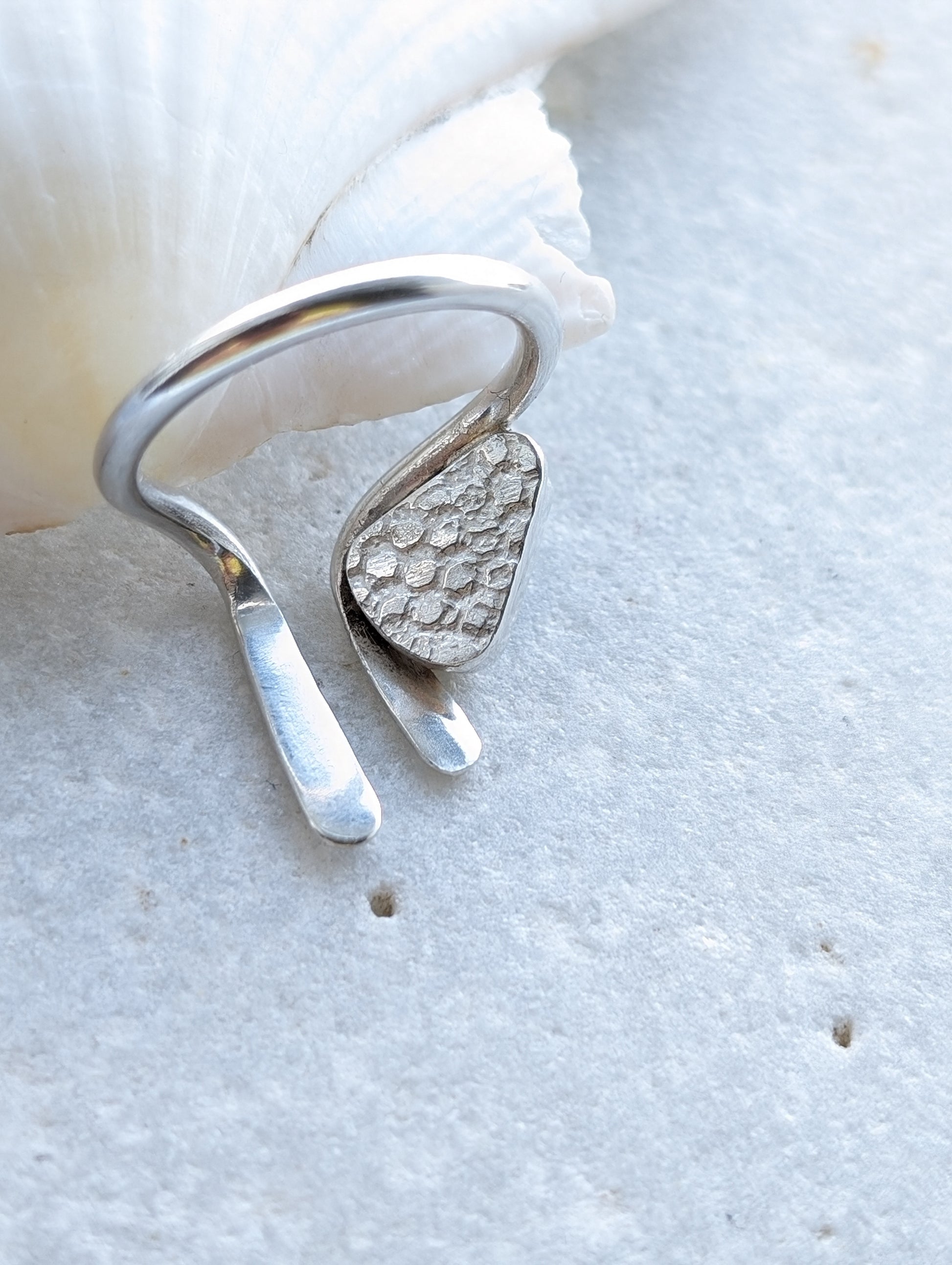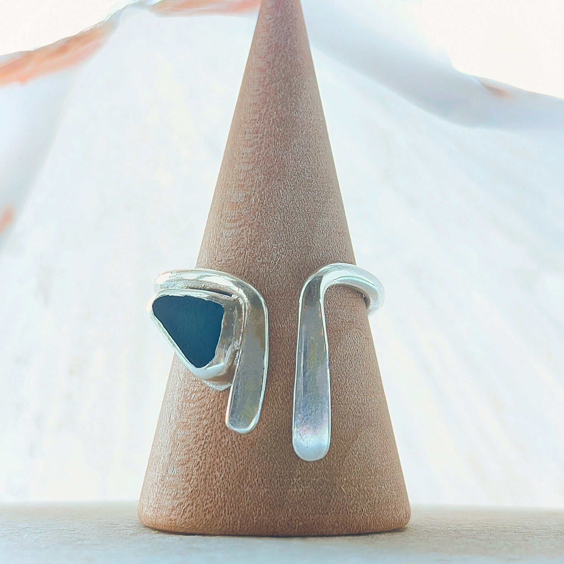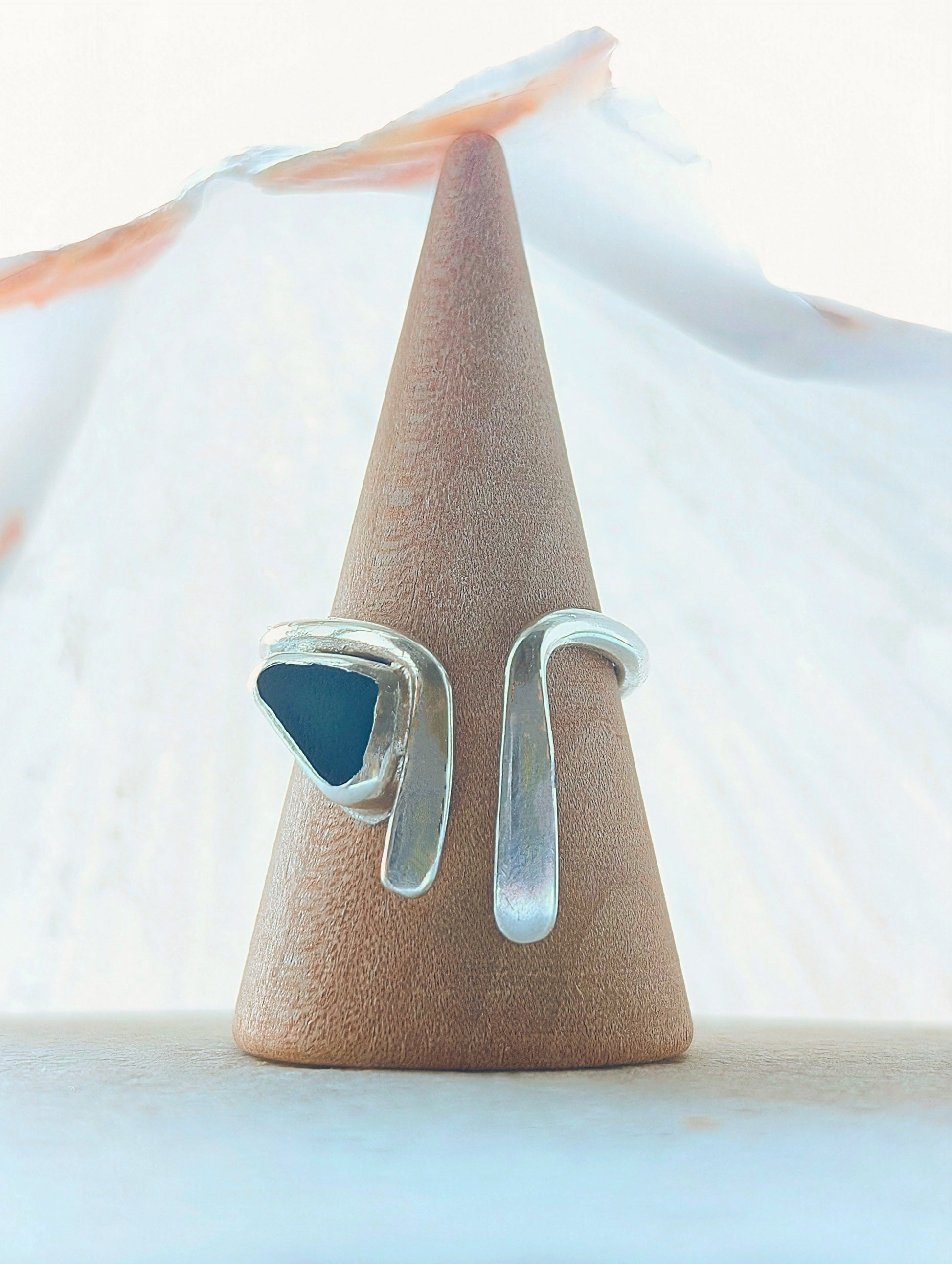 This silver adjustable ring is built around a really unusual shade of green - like gazing into the deepest parts of the ocean. This little shard of fused glass (green on the front and white on the back) was found on Royston Beach (also known as Brick Beach) near Granton in Edinburgh.The glass has been set into a fine silver bezel cup. The remaining silver is 100% recycled sterling silver. Although it's adjustable, it's best suited to a medium-large finger size.