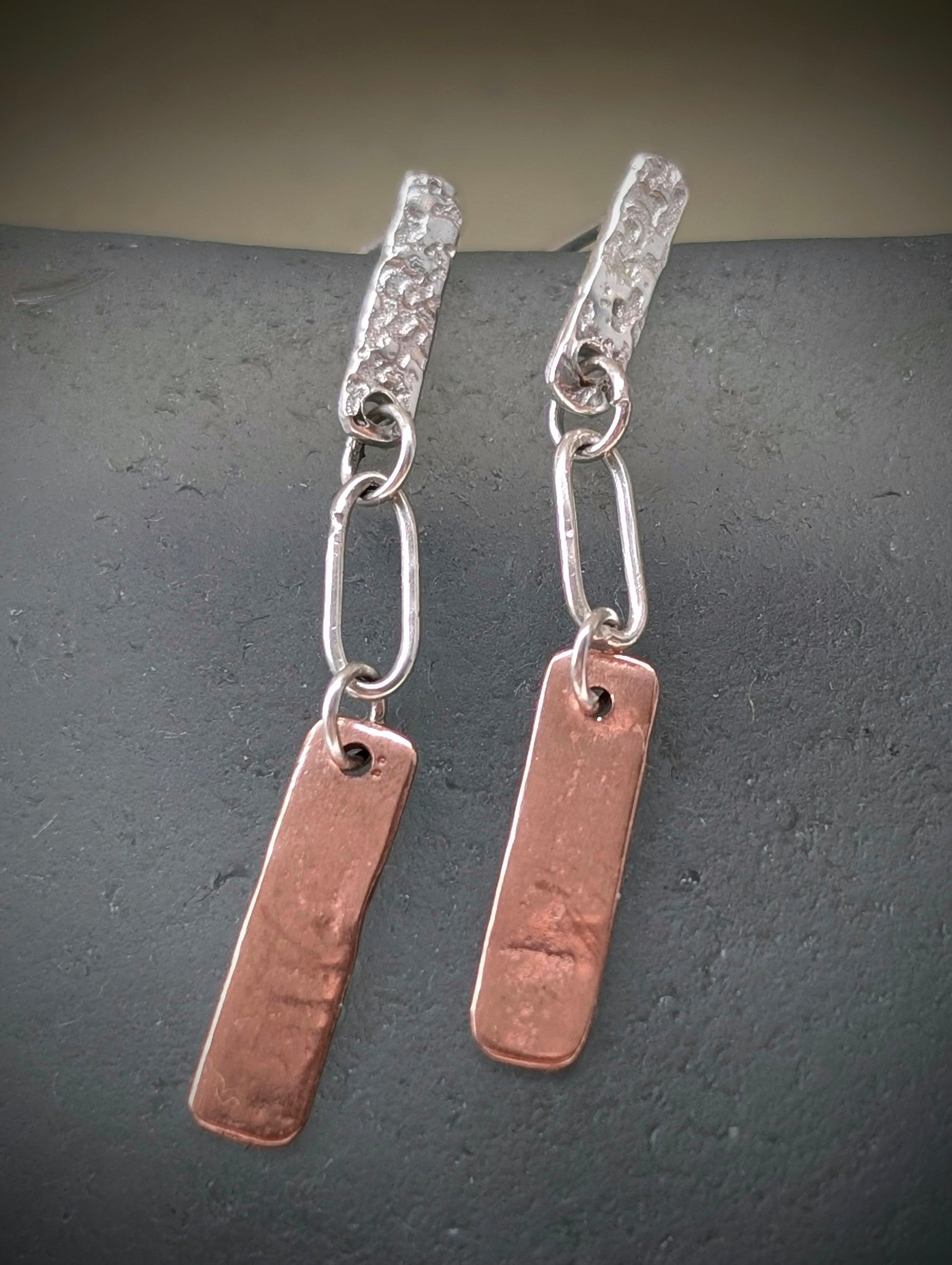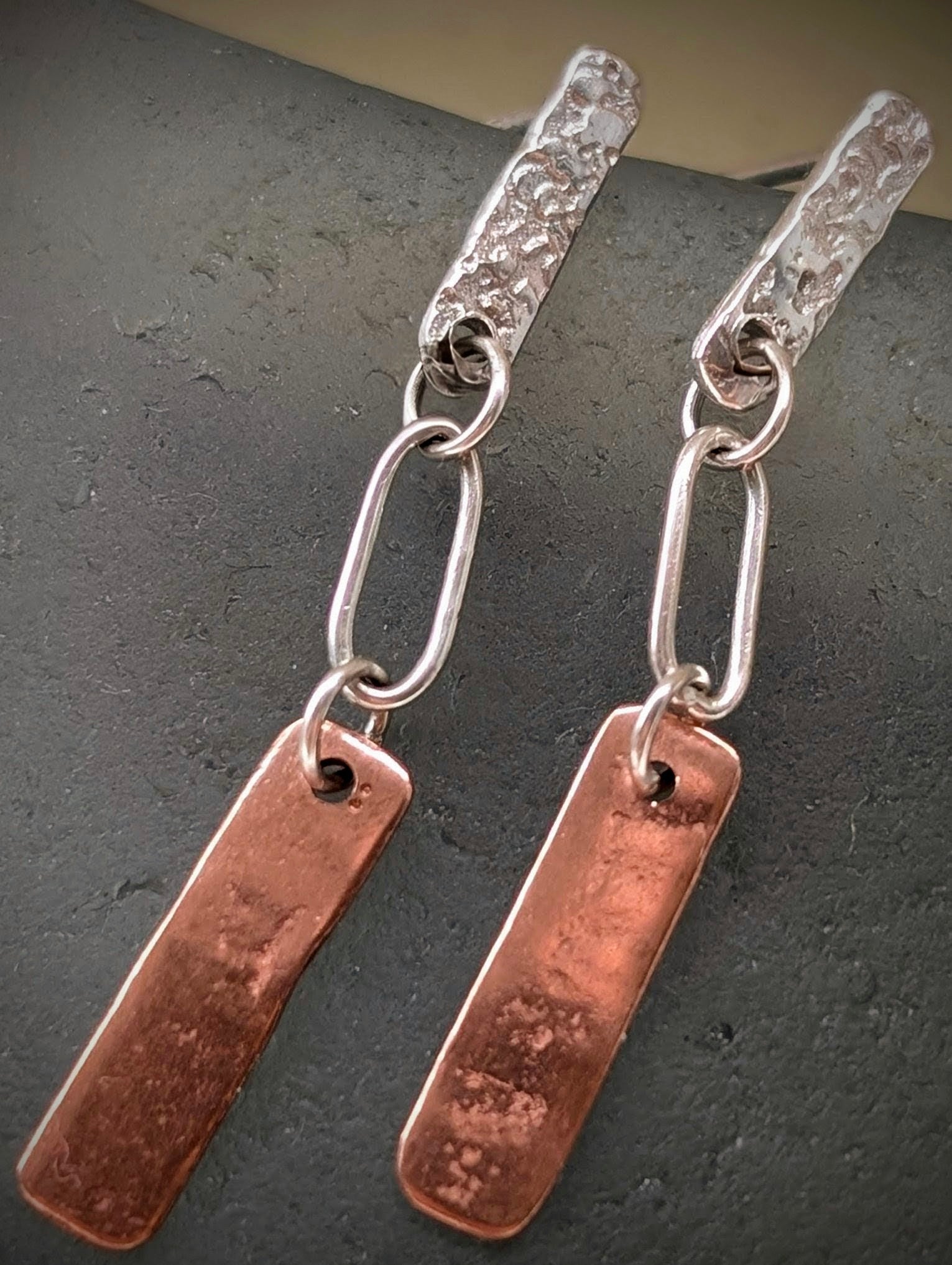These earrings are from the "found metal" collection, made with little pieces of washed-up, sea-worn copper and 100% recycled sterling silver.